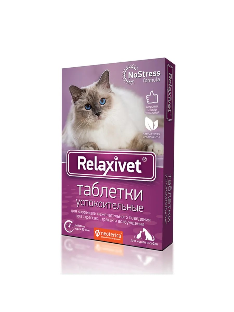 Relaxivet calming tablets have a beneficial effect on the nervous system, help relieve nervous tension and anxiety in animals, especially during transportation, visits to the veterinarian or exhibitions, with fear of loud noises and explosions, and prevent stress.