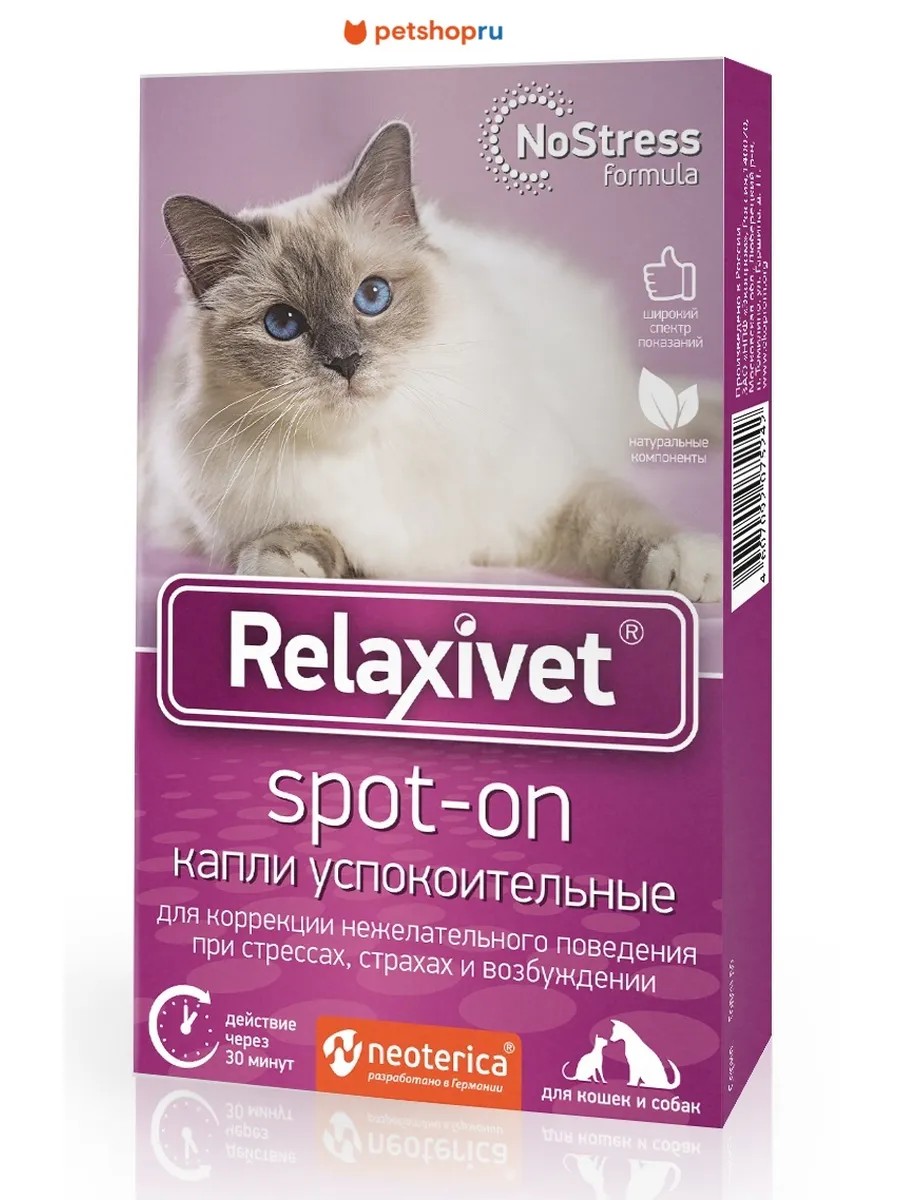 Капли на холку Relaxivet благотворно влияют на нервную систему, способствуют снятию нервного напряжения и беспокойства у животных, особенно при боязни громких шумов и взрывов.