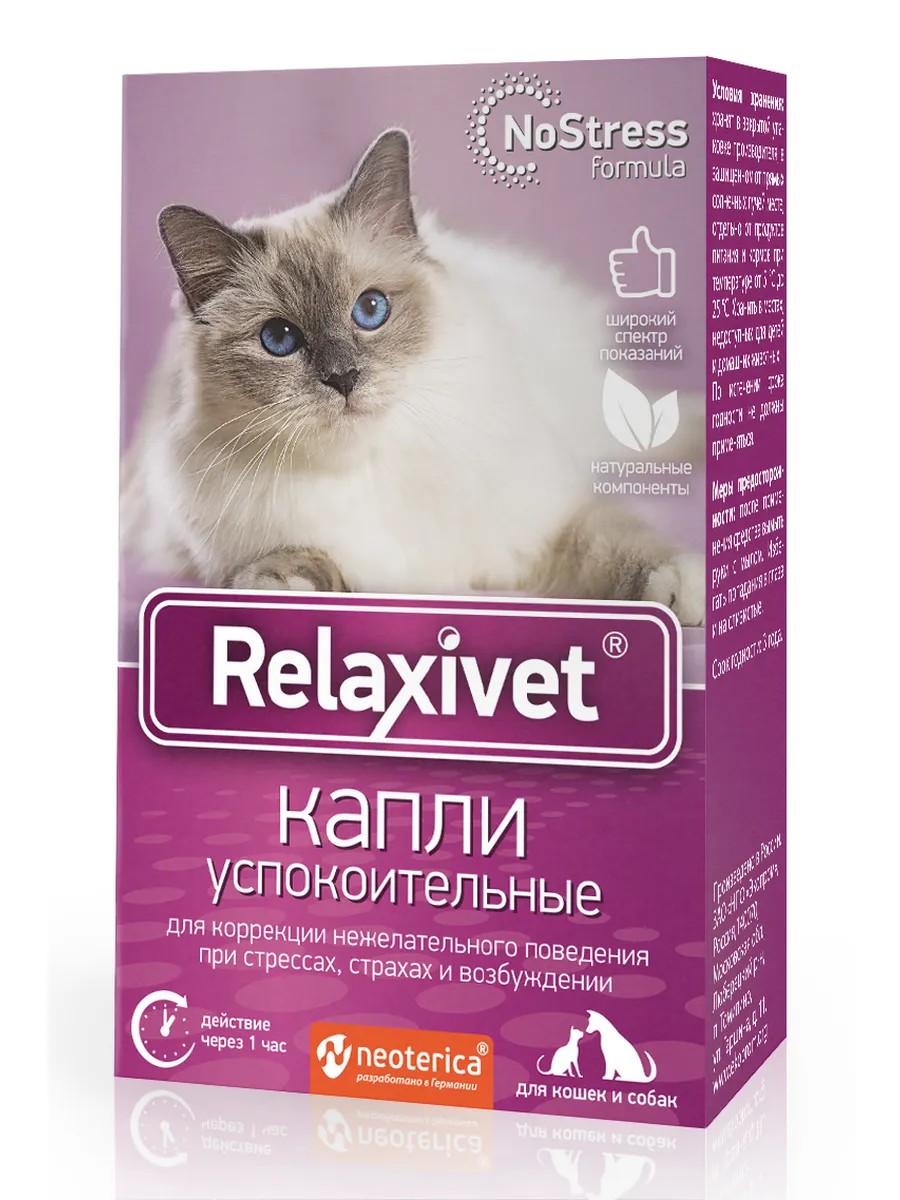 Успокоительные капли Relaxivet благотворно влияют на нервную систему, способствуют снятию нервного напряжения и беспокойства у животных, особенно при транспортировке, половом возбуждении и для профилактики стресса.