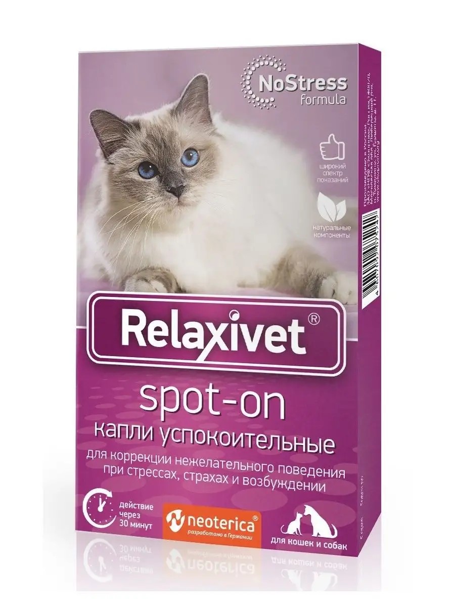 Капли на холку Relaxivet благотворно влияют на нервную систему, способствуют снятию нервного напряжения и беспокойства у животных, особенно при боязни громких шумов и взрывов.