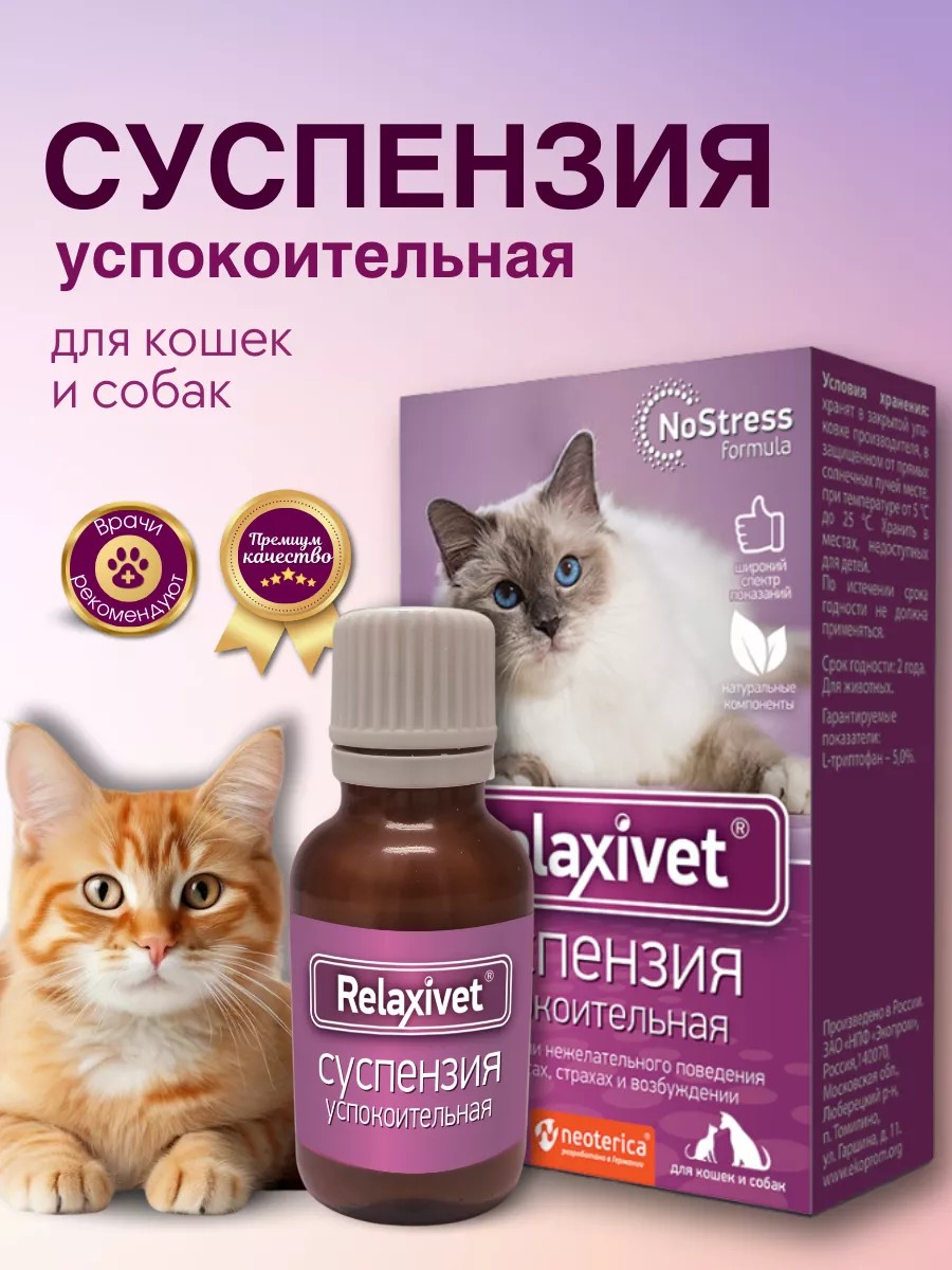 Суспензия успокоительная для кошек и собак Relaxivet 25мл. Relaxivet Успокоительная суспензия. Когда питомцы нервничают, они начинают плохо себя вести: постоянно мяукают или лают, портят мебель и оставляют метки, проявляют агрессию или пугливость. Используйте Relaxivet кошкам и собакам для коррекции поведения, при стрессе, фобиях и возбуждении. Успокоительное средство Relaxivet благотворно влияет на нервную систему, способствует снятию нервного напряжения и беспокойства у животных, особенно при транспортировке, посещении ветеринара или выставок, при страхе громких шумов, профилактике стресса. Успокоительная суспензия Relaxivet на аминокислотах — новое слово в современной ветеринарии. L-триптофан — естественный антидепрессант (предшественник серотонина, «гормона счастья»). L-триптофан снимает нервное напряжение, устраняет чувство тревоги, действует как мягкое успокаивающее средство, поднимает настроение. L-теанин — антиоксидант и природный релаксант. Напрямую влияет на психическую деятельность, уменьшая стресс, тревожность и беспокойство.Инозитол — витаминоподобное вещество: восстановливает структуры нервной ткани, ослабляет чувство страха, уменьшает проявления депрессии. Успокоительная суспензия Relaxivet: действуют через 30 минут; действие длится до 12–24 часов; можно применять курсом до 3 месяцев; абсолютно безопасен; не вызывает привыкания даже при длительном применении. Оптимально использовать при: страхе громких звуков; транспортировке; посещении ветеринара; посещении выставок. Способ применения: 1 мл на 2 кг веса; применять перорально (внутрь) с помощью шприца-дозатора (входит в комплект); при краткосрочном стрессе дайте препарат за 0,5–1 час до предполагаемого стресса, затем повторить процедуру через 1 час после стресса; при необходимости может применяться длительным курсом 2 раза в день в той же дозе; перед применением тщательно встряхнуть. Состав: L-триптофан, L-теанин, инозитол. Состав разработан компанией Neoterica (Германия).