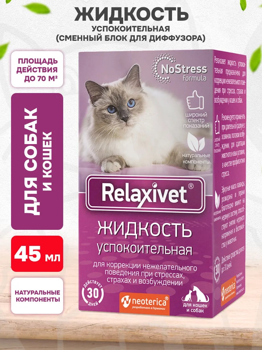 Успокоительная жидкость Relaxivet предназначена для коррекции нежелательного поведения при стрессах, страхах и возбуждении у кошек и собак. Сменный флакон для диффузора.