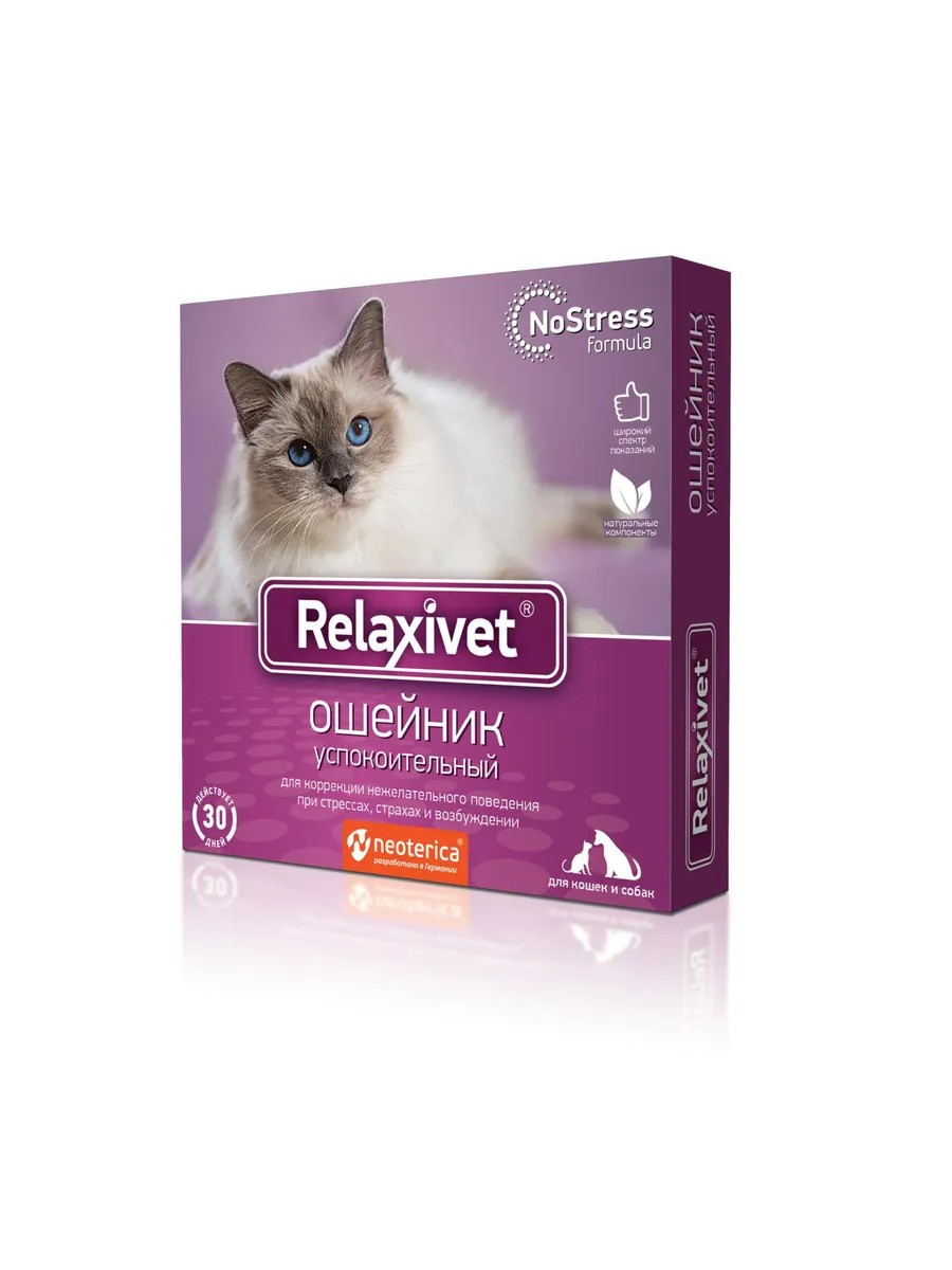 Успокоительный ошейник Relaxivet благотворно влияет на нервную систему, способствует снятию нервного напряжения и беспокойства у животных, особенно при адаптации к новым условиям и половом возбуждении.
