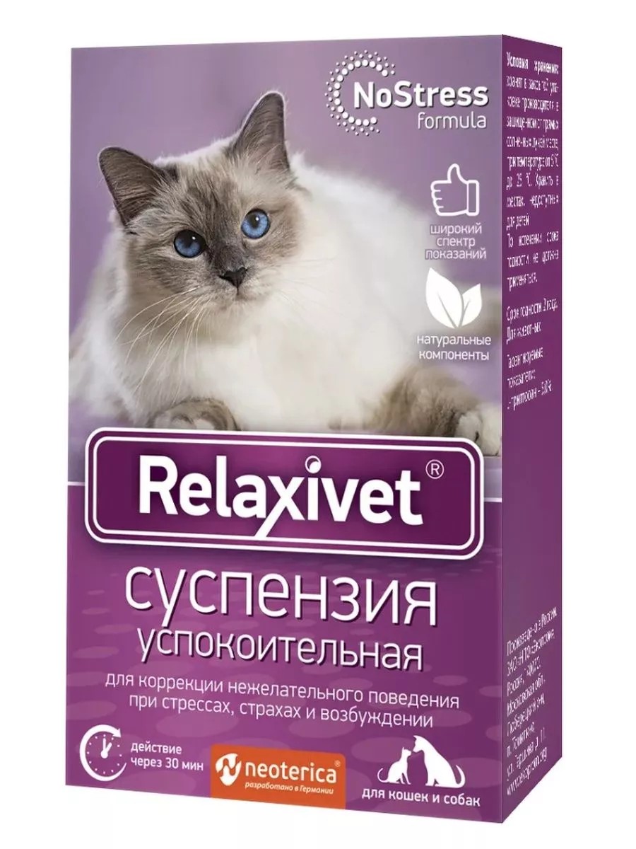 Relaxivet sedative suspension is designed to correct unwanted behavior associated with stress, fear, and excitement in cats and dogs.brRelaxivet sedative suspension prevents the onset and development of stress: L-tryptophan is a natural antidepressant (a precursor to serotonin, the "happiness hormone"). L-tryptophan relieves nervous tension, eliminates anxiety, acts as a mild sedative, and lifts mood. L-theanine is an antioxidant and natural relaxant. Directly affects mental activity, reducing stress, anxiety, and restlessness. Inositol is a vitamin-like substance: it restores the structure of nerve tissue, reduces fear, and reduces the manifestations of depression. It takes effect within 30 minutes, and the effect lasts up to 12–24 hours. Can be used in courses of up to 3 months. Absolutely safe. It is non-addictive, even with long-term use. It can be used for: fear of loud sounds (thunderstorms, firecrackers, fireworks), transportation, visiting a veterinarian, and visiting exhibitions. The composition was developed by Neoterica (Germany). Directions for use: Administer to animals orally (internally). Administer the suspension 0.5-1 hour before exposure to a stress factor, forcefully onto the root of the tongue using a dosing syringe at a rate of 1 ml per 2 kg of body weight. Then repeat the procedure 1 hour after exposure to the stress factor.