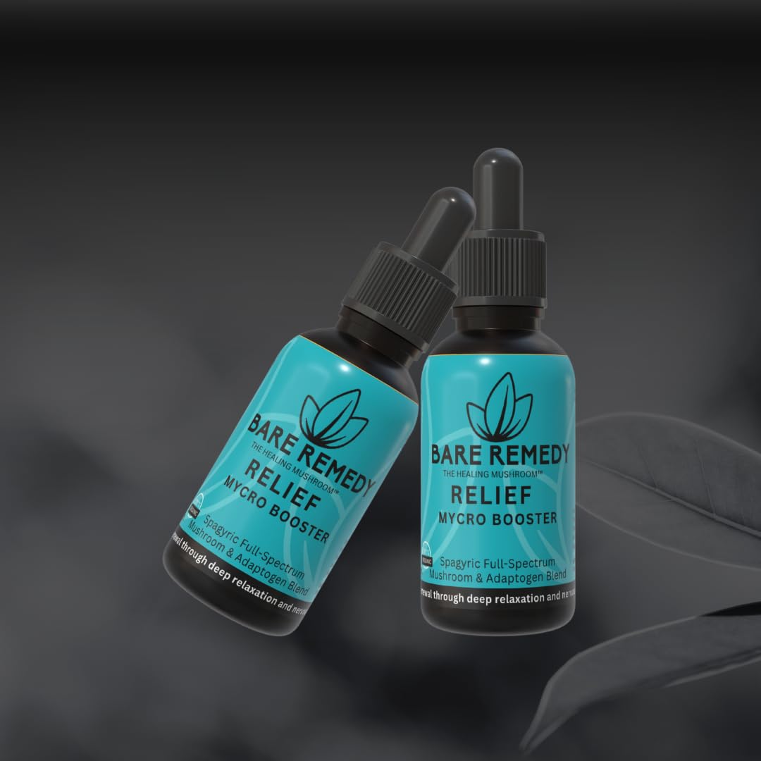 Find your calm and strengthen your resilience with BareRemedy Relief MyCro Booster, the premium organic mushroom extract designed to help you manage stress, improve sleep, and support immune function. Our Relief formula harnesses the power of nature's most effective stress-reducing and immune-supporting mushrooms: Reishi, Turkey Tail, and Maitake, complemented by the renowned adaptogenic herb Ashwagandha. This powerful combination works synergistically to help your body adapt to stress while supporting overall wellness. The cornerstone of our formula, Reishi mushroom (highly regarded mushroom in traditional practices), contains beneficial compounds that support the body's natural stress response and promote relaxation. Combined with Ashwagandha, it creates a powerful stress-relief system that works with your body's natural processes. Our unique spagyric extraction process captures the full spectrum of bioactive compounds from mushroom fruiting bodies (not mycelium on grain), making our extract formulated for optimal absorption and effectiveness. This means you get maximum benefits in a convenient liquid form that works quickly and effectively. Experience the difference with benefits that include: Support for a balanced mood and stress response Improved sleep quality and duration Enhanced immune system function Support for overall wellness and vitality Support for gut microbiome health Our natural formula works with your body's systems to reduce dependency and side effects. Relief MyCro Booster works with your body's natural systems to promote genuine calm and resilience. Our liquid tincture format ensures rapid absorption and is designed for convenient consumption. Simply take 1ml (approximately one dropper) up to three times daily, with an additional dose before bedtime for sleep support. BareRemedy stands for purity and potency. Our Relief formula contains no fillers, artificial ingredients, or synthetic compounds—just concentrated mushroom extracts and organic herbs designed for real results. Transform your approach to stress management with BareRemedy Relief MyCro Booster—your natural path to calm, centered wellness.