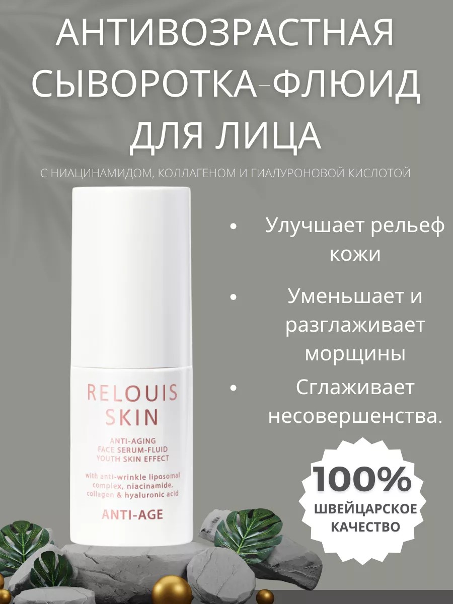 Антивозрастная сыворотка-флюид для лица Эффект молодой кожи от Relouis — это мощное средство, созданное для борьбы с признаками старения. Формула, обогащенная липосомальным комплексом против морщин, ниацинамидом, коллагеном и гиалуроновой кислотой, интенсивно увлажняет и питает кожу, улучшая ее упругость и эластичность. Сыворотка способствует разглаживанию морщин, выравниванию текстуры и придаёт коже здоровое сияние. Легкая текстура флюида быстро впитывается, оставляя ощущение свежести и комфорта. Идеальна для ежедневного ухода за зрелой кожей.