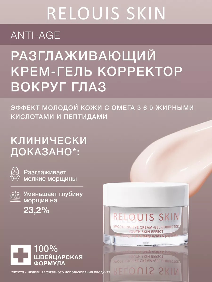 Relouis skin anti-age разглаживающий крем-гель корректор вокруг глаз эффект молодой кожи с омега 3 6 9 жирными кислотами и пептидами. Крем-гель для глаз с активной формулой антивозрастного ухода для нежной кожи вокруг глаз бережно разглаживает мелкие морщины и уменьшает их глубину, нивелирует несовершенства и обеспечивает мгновенный эффект цветокоррекции темных кругов. Клинически доказано спустя 4 недели регулярного использования крема для кожи вокруг глаз: разглаживаются мелкие морщины, уменьшается глубина морщин на 23.2%. Такие результаты достигаются за счет активных компонентов крема: омега 3 6 9 жирные кислоты - сочетание масел семян макадамии, оливы и подсолнечника, способствует повышению эластичности и тургора кожи, увлажняют и оказывают регенерирующее действие; пептиды, полученные из стволовых клеток гардении, служат для достижения значительного антивозрастного эффекта в области глаз, помогают разгладить морщины, улучшить эластичность кожи, осветлить темные круги. Крем вокруг глаз подходит для всех типов кожи (в том числе чувствительной). 100% формула и текстура компании crb s.a., швейцария, intercos group. Основная миссия релуи скин – предоставить прекрасной половине человечества лучшие средства для ухода за кожей, созданные профессионалами из разных уголков мира. Заветные слова «100% швейцарская формула» -не просто маркетинг, а клинически доказанные действия каждого средства из линии релуи скин. Способ применения: нанесите средство утром на очищенную кожу области вокруг глаз, легкими вбивающими движениями до полного впитывания. Не использовать по назначению по истечении срока годности. Противопоказания: индивидуальная непереносимость компонентов. Хранить при температуре: 5 0c - 25 0c без доступа прямых солнечных лучей. Изготовитель: ООО «Релуи бел», Беларусь