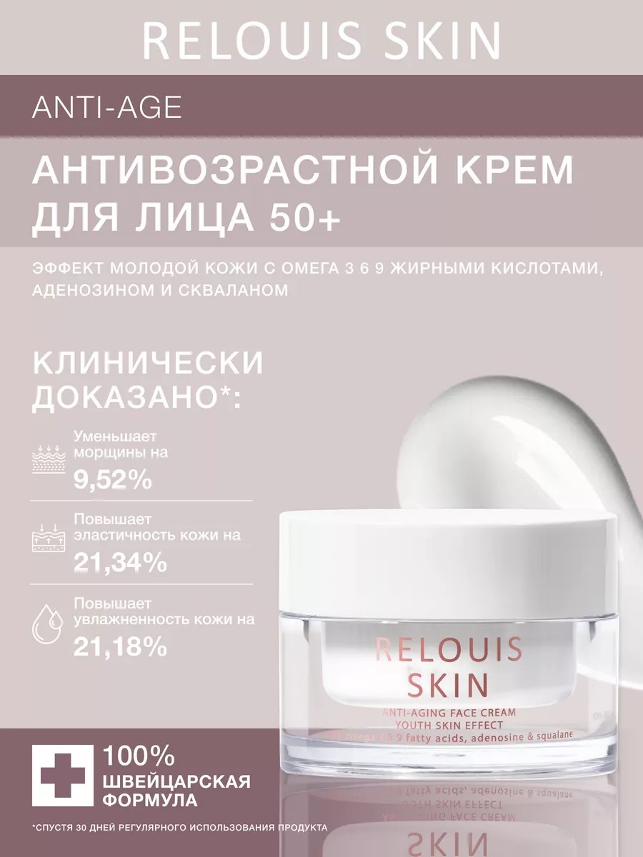 Relouis skin anti-age антивозрастной крем для лица эффект молодой кожи с омега 3 6 9 жирными кислотами, аденозином и скваланом. Крем для борьбы с первыми признаками старения кожи - сухостью, потерей эластичности и появлением морщин. Насыщенная, шелковистая ламеллярная текстура крема обеспечивает эффективный антивозрастной уход: глубоко увлажняет кожу, повышает ее упругость и эластичность, способствует снижению трансэпидермальной потери воды, устраняет небольшие неровности кожи. Клинически доказано спустя 30 дней регулярного использования продукта: уменьшаются морщины на 9,52 %, повышается эластичность кожи на 21,34%, повышается увлажненность кожи на 21,18 %, повышается глубокая гидратация кожи на 18,12%, повышается упругость кожи на 12,36 %, снижается трансэпидермальная потеря воды на 4,87%. Такие результаты достигаются благодаря активным компонентам крема для лица: омега 3 6 9 жирные кислоты - сочетание масел семян макадамии, оливы и подсолнечника, способствует повышению эластичности и тургора кожи, увлажняют и оказывают регенерирующее действие; аденозин обладает омолаживающими свойствами, влияет на синтез эластина и коллагена, ускоряет регенерацию клеток; сквалан – натуральный, смягчающий компонент, получаемый из оливы, обеспечивает восстановление упругости и эластичности кожи. Крем подходит для всех типов кожи, в том числе чувствительной. 100% формула и текстура компании crb s.a., швейцария, intercos group. Основная миссия релуи скин – предоставить прекрасной половине человечества лучшие средства для ухода за кожей, созданные профессионалами из разных уголков мира. Заветные слова «100% швейцарская формула» - не просто маркетинг, а клинически доказанные действия каждого средства из линии релуи скин. Способ применения: нанесите утром и/или вечером крем на очищенную кожу лица. Не использовать по назначению по истечении срока годности. Противопоказания: индивидуальная непереносимость компонентов. Хранить при температуре: 5c - 25c без доступа прямых солнечных лучей.