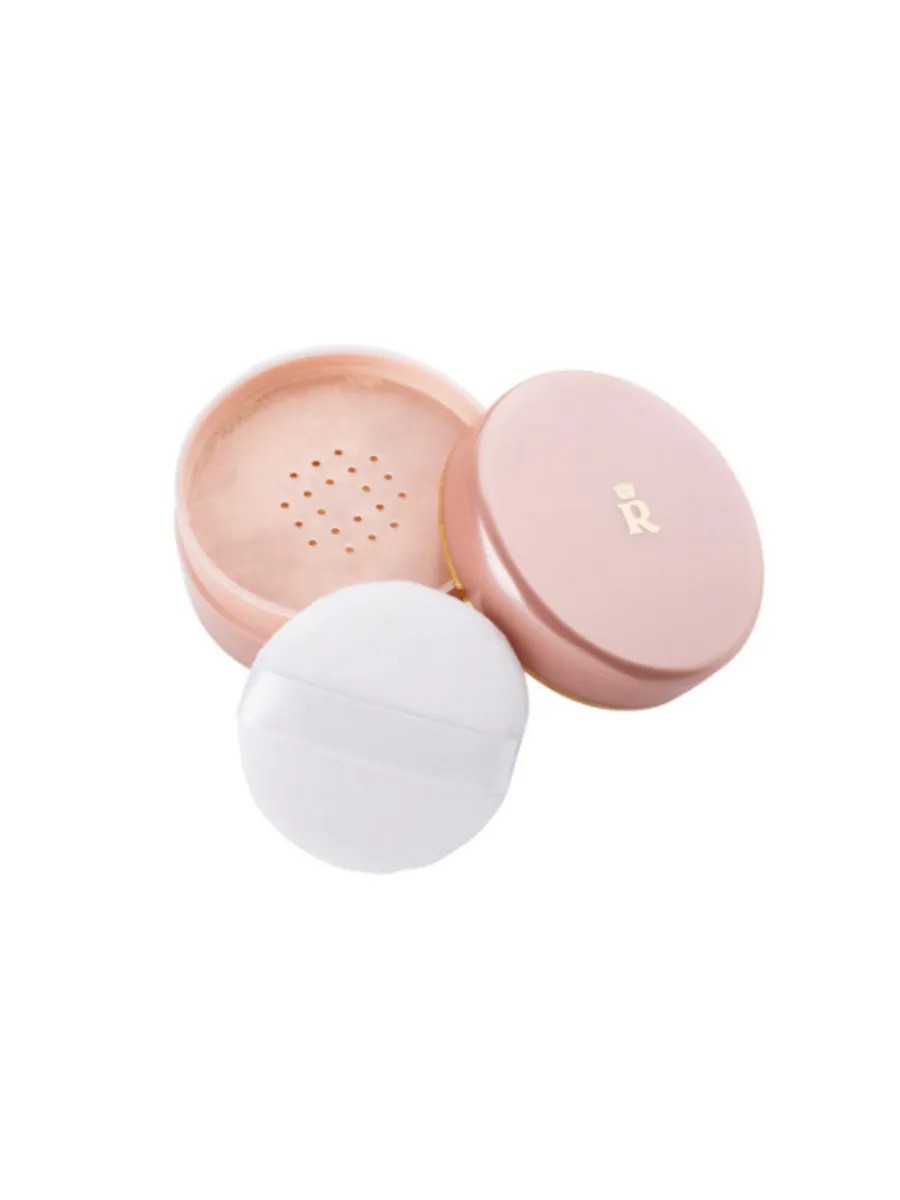 A cotton powder puff with a white ribbon allows for quick powder application.