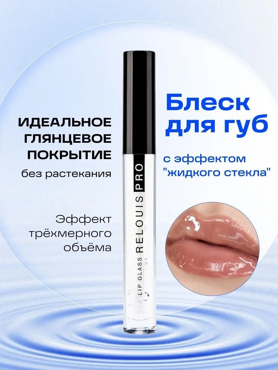 One of the hottest trends is clear gloss with a "**liquid glass"** effect! It creates a smooth, ultra-glossy finish on the lips, turning any lip makeup into a work of art! Today, clear lacquer gloss is at the top of the list of most used makeup looks on the runways: makeup artists are using it extensively in creating looks for fashion shows, applying the product not only to lips but also to skin, over powder eyeshadow, and over glitter. Applied as a top coat (over another product), the gloss makes any color more intense and voluminous—it's as if you're looking at it through glass. **Perfect glossy finish. 3D volume effect. No bleeding**—these are the three main properties of Lip Glass. The gloss's thick texture glides on perfectly. With Lip Glass, lips look juicy, hydrated, fuller, and at the same time natural. Relouis, Belarusian cosmetics, liquid glass, for lips, makeup artist, makeup, glossy eyeshadow, liquid glass effect, wet look eyes. Bestseller.