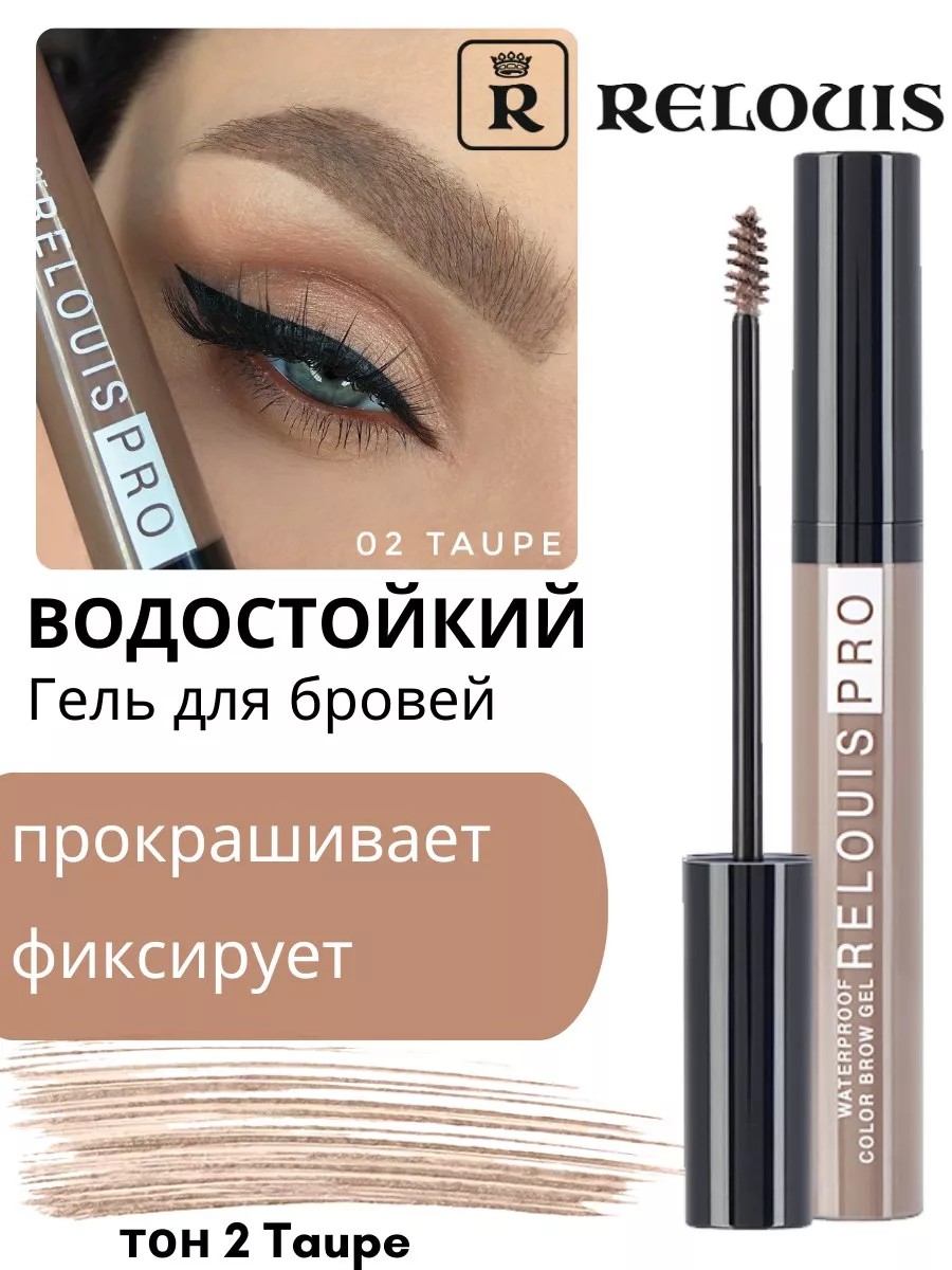 Tinted eyebrow gel from the Belarusian brand Relouis. The unique waterproof formula provides secure hold and perfect shape for your brows. Brown pigments add color to the hairs and fill in gaps like a tint, creating a natural, long-lasting look. A small, thin Italian brush ensures even application and coloring. This fixing mascara comes in four shades, making it suitable for both blondes and brunettes.