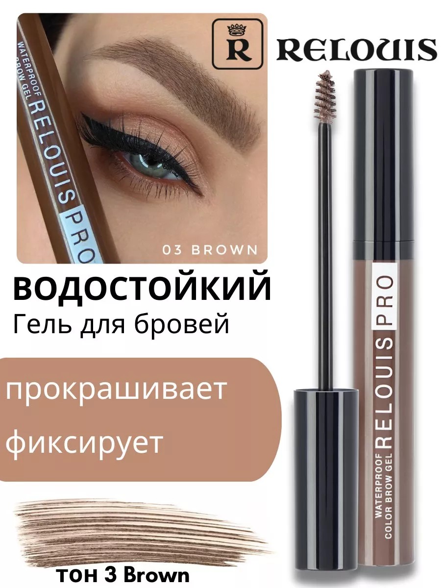 Tinted eyebrow gel from the Belarusian brand Relouis. The unique waterproof formula provides secure hold and perfect shape for your brows. Brown pigments add color to the hairs and fill in gaps like a tint, creating a natural, long-lasting look. A small, thin Italian brush ensures even application and coloring. This fixing mascara comes in four shades, making it suitable for both blondes and brunettes.