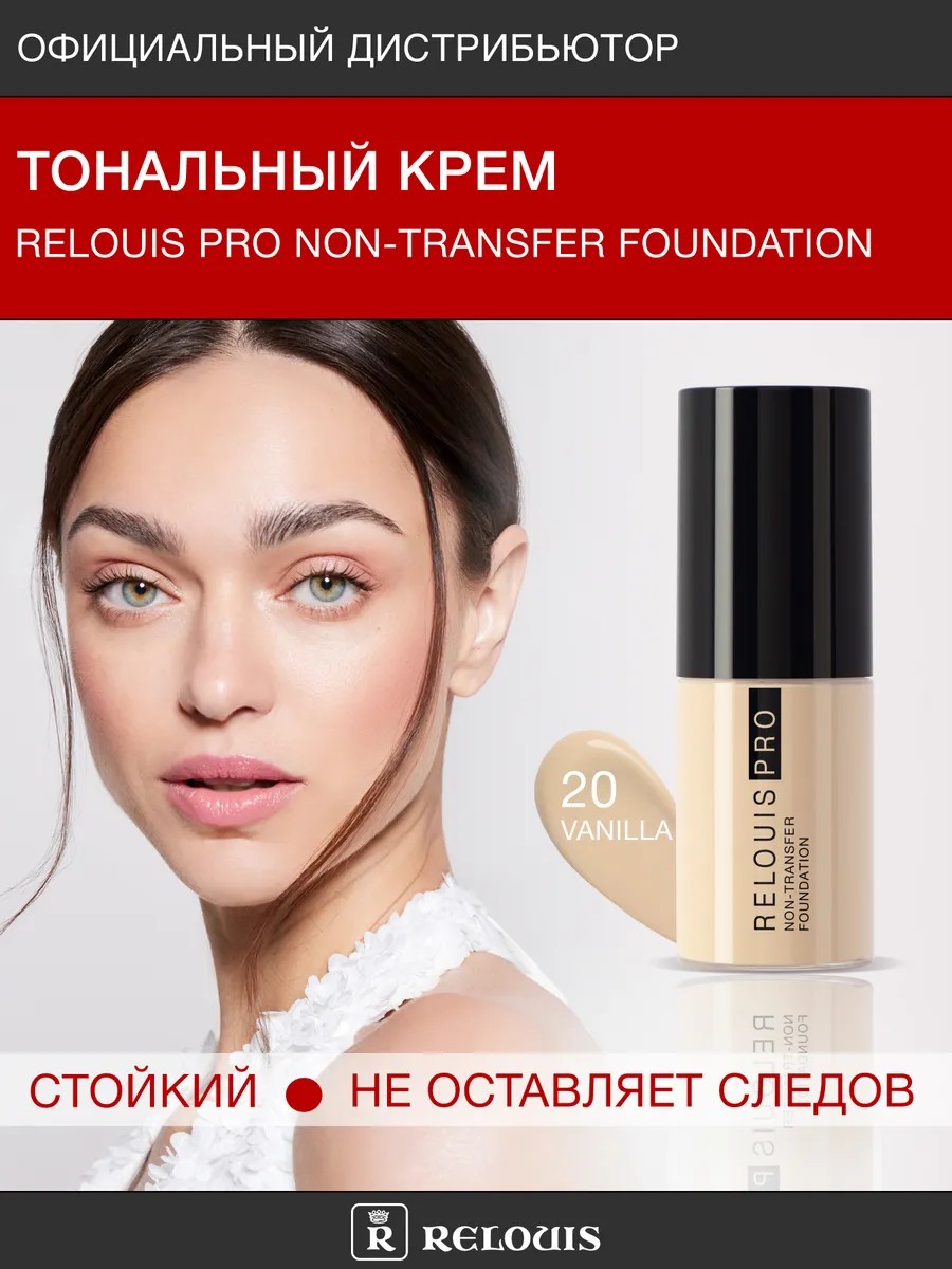 Non-transfer остаётся только на вашей коже. Исключительная стойкость на коже до 8 часов с эффектом \non-transfer\: без переноса тонального крема на одежду или экран телефона невесомая, легко наслаиваемая текстура без эффекта маски натуральный финиш и великолепный внешний вид при любом освещении содержит 95 % компонентов натурального происхождения,подходит для всех типов кожи. Оттенки: 10 ivory - светлый оттенок слоновой кости, идеален для белоснежек. 20 vanilla — светлый оттенок с ванильно-бежевым подтоном\n30 nude — средний бежевый с нейтральным подтоном\n40 beige — натуральный бежевый с тёплым подтоном. Способ применения: нанесите тональный крем на кожу лица и равномерно распределите кистью или спонжем.