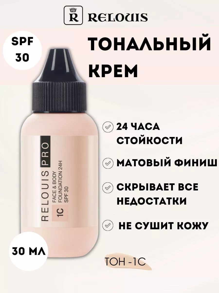 Тип кожи: подходит для всех типов кожиТОНАЛЬНЫЙ КРЕМ RELOUIS PRO FACE&BODY FOUNDATION 24H SPF30 \vлегко распределяется, создавая основу для идеального макияжа, гарантирует facetune эффект и помогает коже выглядеть идеально на фото.1C (c — cold) – светлый холодный оттенок для светлой кожи с холодным подтоном, которая почти не загорает