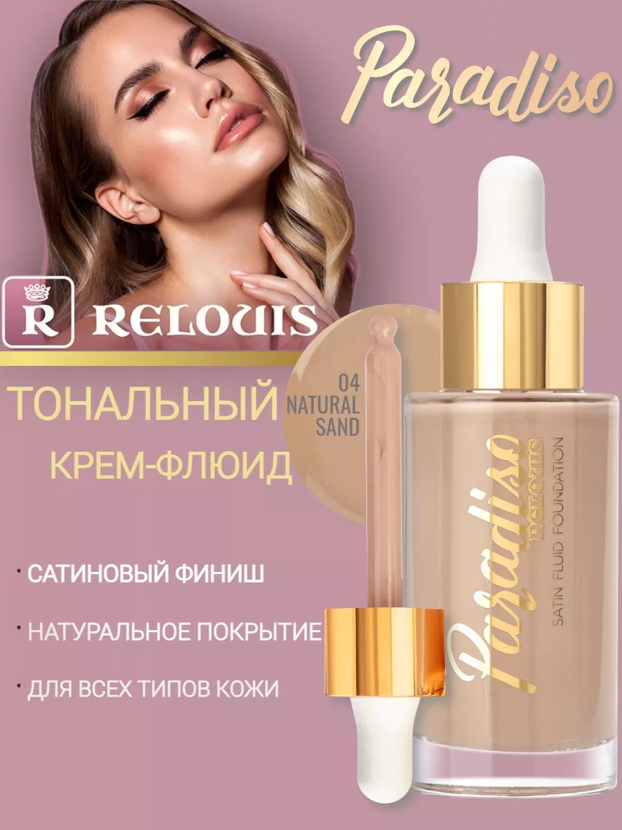 Идеальное средство для создания ровного и естественного сатинового финиша на вашем лице - Тональный крем-флюид с сатиновым финишем PARADISO RELOUIS. Его легкая и комфортная текстура как вуаль скрывает недостатки кожи, а сок алоэ-вера и гиалуронат натрия увлажняют, тонизируют и улучшают структуру кожи. Получите идеальный результат каждый день с невесомой вуалью, сатиновым финишем, натуральным покрытием и идеальной фиксацией. Этот тональный крем-флюид подходит для всех типов кожи, не сушит ее и обеспечивает матирующее и выравнивающее действие. Тональный крем-флюид - это идеальная косметика для лета. Тональник представлен в 4 тонах - от очень светлого до натурального бежевого. Содержащий гиалуроновую кислоту, он подстраивается под тон вашей кожи, создавая эффект nude cover на вашем face. Это не просто тоналка, это foundation, который придает вашей коже true skin эффект. Оригинальный тоналтный крем, подходящий для всех типов кожи, легко наносится и не оставляет белых следов. Этот тональныц крем тонирует вашу кожу, придавая ей естественный и здоровый вид. Более того, он абсолютно некомедогенный, что делает его идеальным выбором для тех, кто стремится к здоровой и сияющей кожи. Этот крем для выравнивания тона лица с гиалуроновой кислотой - это тональный крем , который идеально подходит для нанесения на лицо. Он является оригиналом среди тональных кремов fvo и идеально подходит для сухой кожи. Этот белорусский тональный крем для лица обеспечивает идеальное покрытие и выравнивание тона, делая вашу кожу сияющей и здоровой. Тональный крем для лица PARADISO - это идеальный выбор для тех, кто ищет качественный и надежный продукт для ухода за кожей, флюид станет не заменимым средством для макияжа в вашей косметичке. Способ применения: встряхните флакон перед использованием. С помощью пипетки нанесите несколько капель крема-флюида непосредственно на кожу или на кисть (спонж), равномерно распределите. Для большей стойкости зафиксируйте покрытие пудрой для лица.