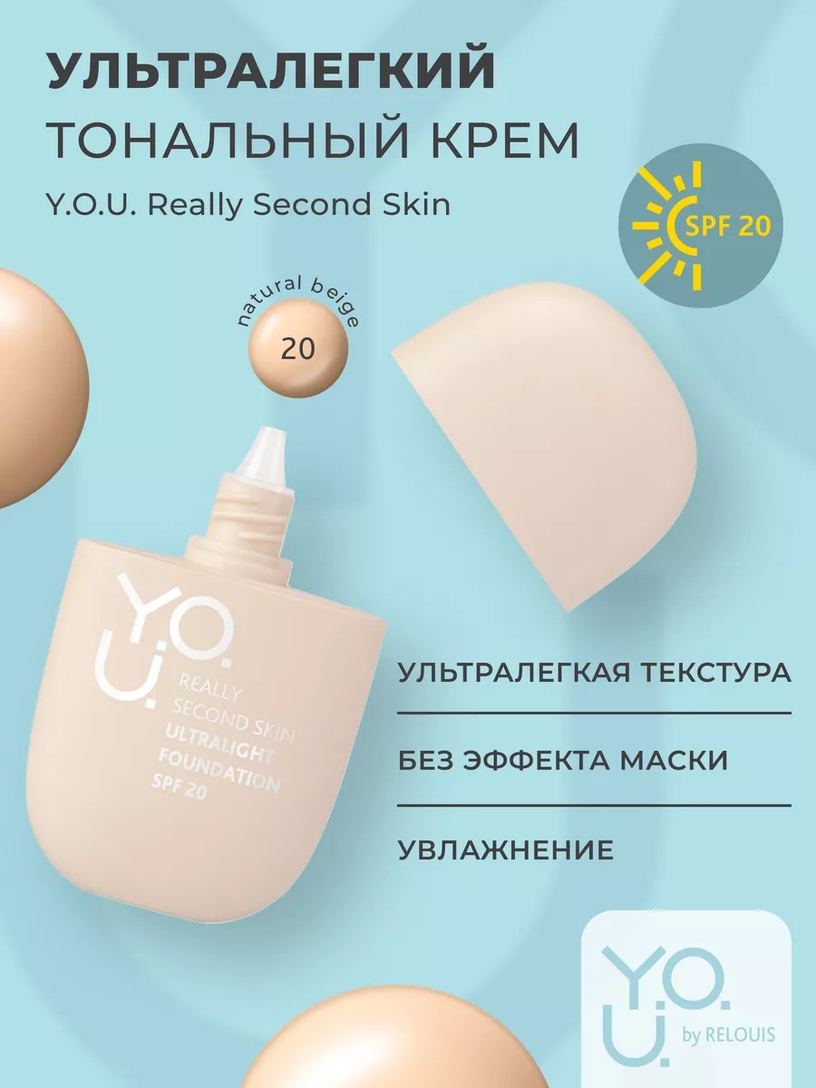 Твоя кожа, только лучше с ультратонким тональным кремом для лица Y.O.U. Really Second Skin с SPF 20. Забудь о несовершенствах — ультралегкая текстура тональника не забивает поры, визуально сглаживает морщинки и с легкостью освежает образ. Тональный крем для лица содержит натуральные компоненты: Экстракт корней пиона является природным антиоксидантом, уменьшает гиперпигментацию кожи. Трегалоза идеальна для увлажнения, восстанавливает защитную барьерную структуру кожи за счет снижения трансэпидермальной потери воды. Ультралегкая текстура флюида, без утяжеления, без эффекта маски. Нанесение от легкого к среднему. Натуральный ровный тон. Скрывает мелкие недостатки, не забивается в поры, не подчеркивает морщинки. SPF 20 защищает от солнечных лучей и предотвращает фотостарение. Комплекс натуральных экстрактов активно увлажняет кожу, оказывает регенерирующее и восстанавливающее действие. Экстракт корней пиона уменьшает гиперпигментацию кожи, является природным антиоксидантом. Трегалоза — увлажняет кожу, восстанавливает защитную барьерную структуру. тоналка для лица Y.O.U. Really Second Skin станет не заменимым отрибутом декоративной косметики в вашей косметичке. Ультралегкий bb крем завоевал сердца блогеров, инфлюенс, современных девушек, деловых женщин. Оригинальная белорусская косметика = качество. Новая коллекция декоративной косметики от белорусского бренда RELOUIS. Линия декоративной косметики Y.O.U.: красота — это ТЫ.