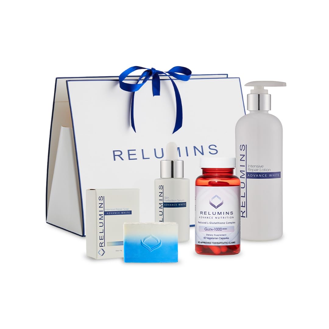 ELEGANT BEAUTY GIFT SET - The Relumins Night Recovery and Glow Set is presented as an elegant present for daily use. This beauty gift supports wellness and self-care routines. Each item works together as a coordinated skincare bundle. Ideal for modern facial care lifestyles. AHA SERUM FOR RADIANT LOOK - The AHA serum is formulated for use during night routines. It supports smoother texture and radiant appearance with regular application. Designed to pair with cleansing soap and lotion. A key step in facial self-care. NIGHT REPAIR LOTION FOR MOISTURE CARE - The Night Repair Lotion delivers nourishing hydration during overnight routines. It supports moisturizing needs to help skin feel soft by morning. Designed for daily evening application. Enhances comfort within a complete skincare bundle. GLUTA1000 CAPSULES FOR EVENING SUPPORT - Relumins Gluta 1000 capsules are designed for consistent nighttime use as part of a wellness focused routine. They complement topical skincare steps within the bundle. Supports self-care habits from within. Ideal for maintaining refreshed facial skin. OVERNIGHT SKINCARE ESSENTIALS - The Relumins Night Recovery and Glow Set is a complete skincare bundle designed for evening facial care. This cosmetic collection supports hydration and moisturizing while you rest. Each product fits seamlessly into a nighttime routine. Ideal for maintaining a radiant appearance and smooth texture. Your Skin's Perfect Match.