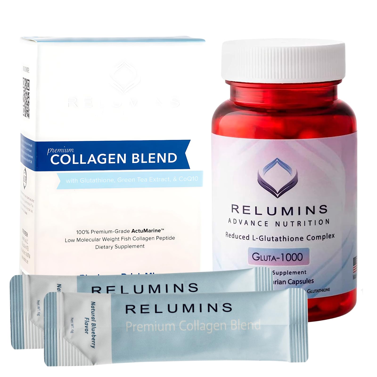 The Relumins Premium Collagen Gluta-1000 Bundle features 10 sachets of Marine Collagen (Blueberry flavor) and 60 vegetarian Gluta-1000 Capsules, designed to enhance skin health and overall wellness. The collagen blend is rich in L-Glutathione Complex (including Reduced L-Glutathione, Alpha Lipoic Acid, and Rose Hips) to support skin appearance and hydration. The convenient, blueberry-flavored collagen is a tasty addition to your daily routine, with no unpleasant aftertaste. The Gluta-1000 capsules contain ActuMarine Collagen from Japan for rapid absorption, helping to support your skin and overall wellness. Both products are Halal, Kosher, vegan, and made in cGMP-certified facilities to ensure top quality and effectiveness.ertified Quality Dietary-Friendly: Both the collagen sachets and Gluta-1000 Capsules are Halal, Kosher, and made in cGMP-certified facilities, ensuring the highest quality standards. These products are also vegan-friendly, making them suitable for a wide range of dietary preferences and offering an effective and safe choice for your skin health. Tasty and Convenient: The blueberry-flavored collagen sachets are not only effective but enjoyable to take. Just mix with water, and you'll experience a refreshing, naturally flavored supplement that's easy to incorporate into your daily wellness routine, without any unwanted aftertaste. Hydration Skin Health Support: The addition of ActuMarine Collagen from Japan ensures rapid absorption, delivering collagen to where it's needed most. This helps support skin hydration, improve tone, and promote a smoother, refreshed look. The formula also helps in supporting healthy, radiant skin overall. Advanced Gluta-1000 Formula with L-Glutathione Complex: This supplement features 1000mg of L-Glutathione Complex, combining Reduced L-Glutathione, Alpha Lipoic Acid, and Rose Hips to provide superior antioxidant support. Alpha Lipoic Acid enhances glutathione levels, while Rose Hips deliver an absorbable form of Vitamin C, working synergistically to maintain a vibrant appearance. Premium Marine Collagen (10 Sachets): The Marine Collagen Blend is made with high-quality marine-derived collagen to support healthy, youthful-looking skin. With the refreshing blueberry flavor, this easy-to-use collagen supplement helps restore skin tone while offering a delicious, smooth taste—no unpleasant aftertaste!.