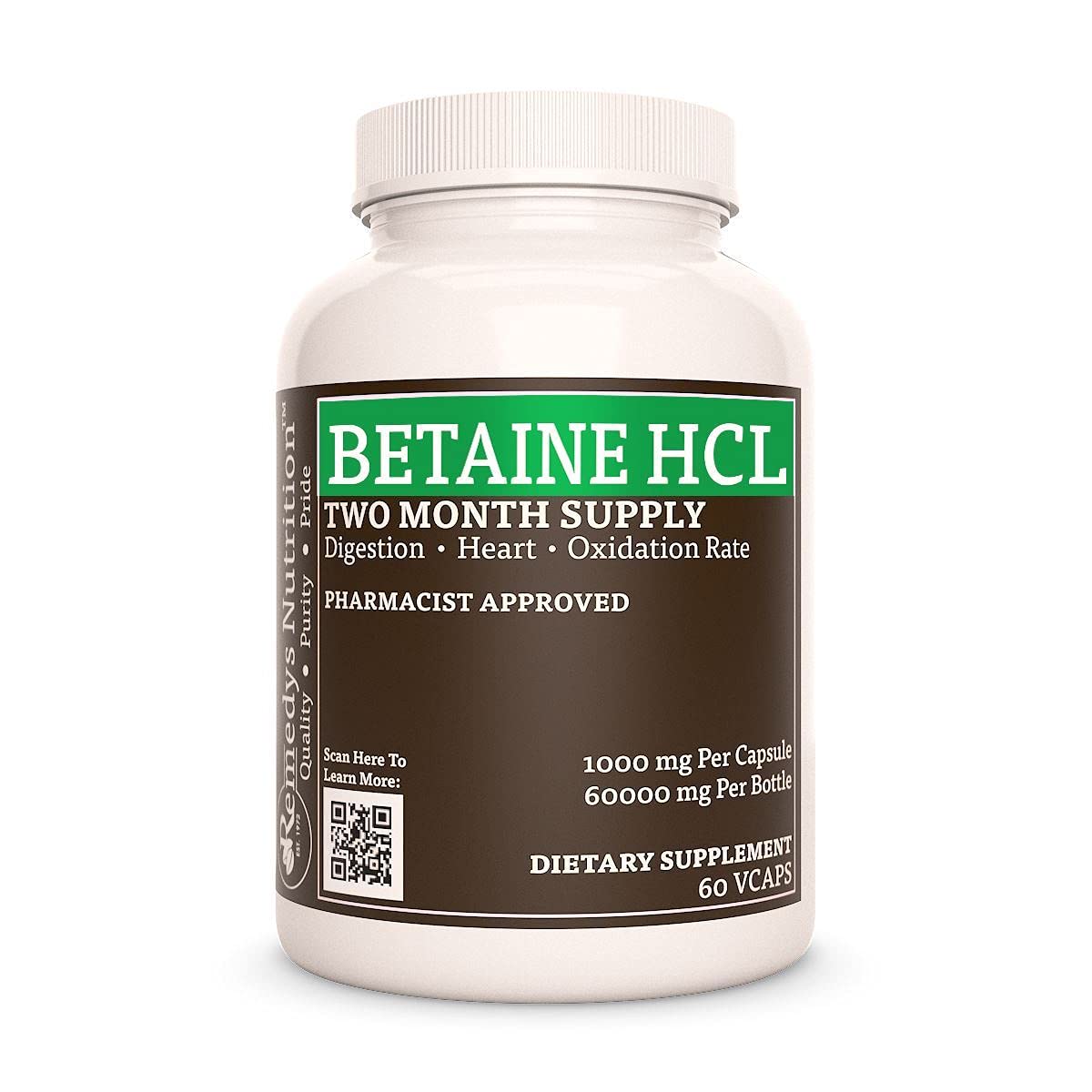 Remedy s Nutrition Betaine HCL (Hydrochloride) | 1 000 mg 60 Capsules Dietary Supplement | Two Month Supply | Also Contains Calcium Carbonate Papain & Bromelain