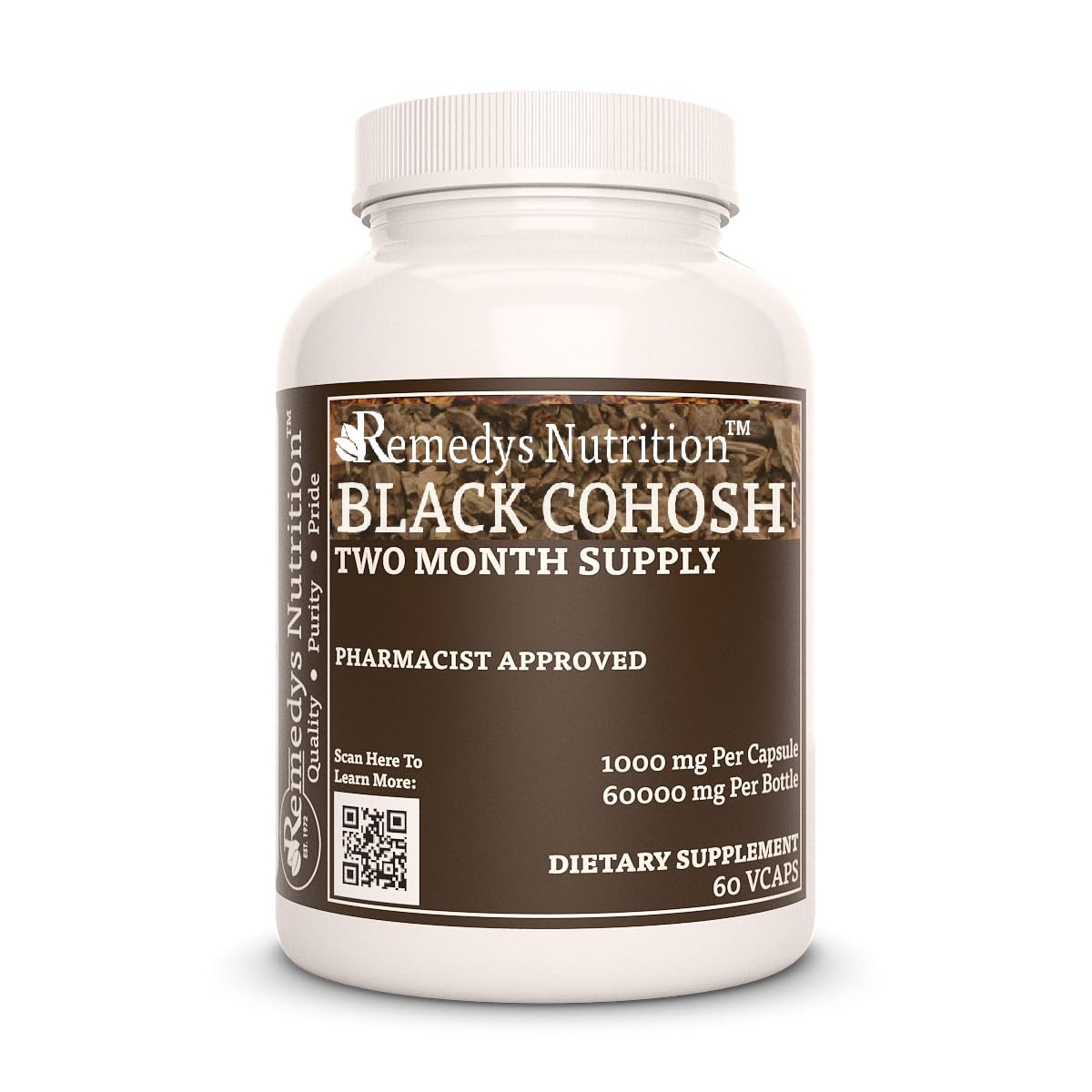 A LEGACY OF 50 YEARS: We are more than a family we are a collective of passionate nutritionists, herbalists, and healthcare professionals united in our mission to blend traditional wisdom with the advancements of modern science. Since 1972, each of our products has been meticulously handcrafted to order, lovingly created in our family-owned business location, ensuring that you receive nothing but the finest quality with every purchase. YOUR SAFETY: Our meticulously crafted supplements are not just born from scientific rigor, but also infused with traditional herbal wisdom. With a legacy of over 50 years of dedicated research, rigorous testing, and continuous improvement, we have woven a tapestry of reliability you can confidently rely on. Embrace the essence of trust and safety with Remedy's Nutrition. HIGH QUALITY: This supplement contains premium ingredient Actaea Racemosa, sourced without compromise. It's a gluten-free, wheat-free, yeast-free, and lactose-free product, as we prioritize your well-being above all else. Itâ€s also free from artificial flavors, sweeteners, additives, and preservatives, and suitable for vegetarians and vegans. WHAT YOU GET: One Bottle of Remedy's Nutrition Black Cohosh herbal dietary supplement with sixty 1000mg vegan capsules. (Two Month Supply). THE HERB: Black Cohosh (Actaea racemosa) is a perennial herb native to North America, traditionally used by Indigenous communities and later adopted in Western herbal practices. The root is the most commonly used part, known for its deep roots in botanical tradition.