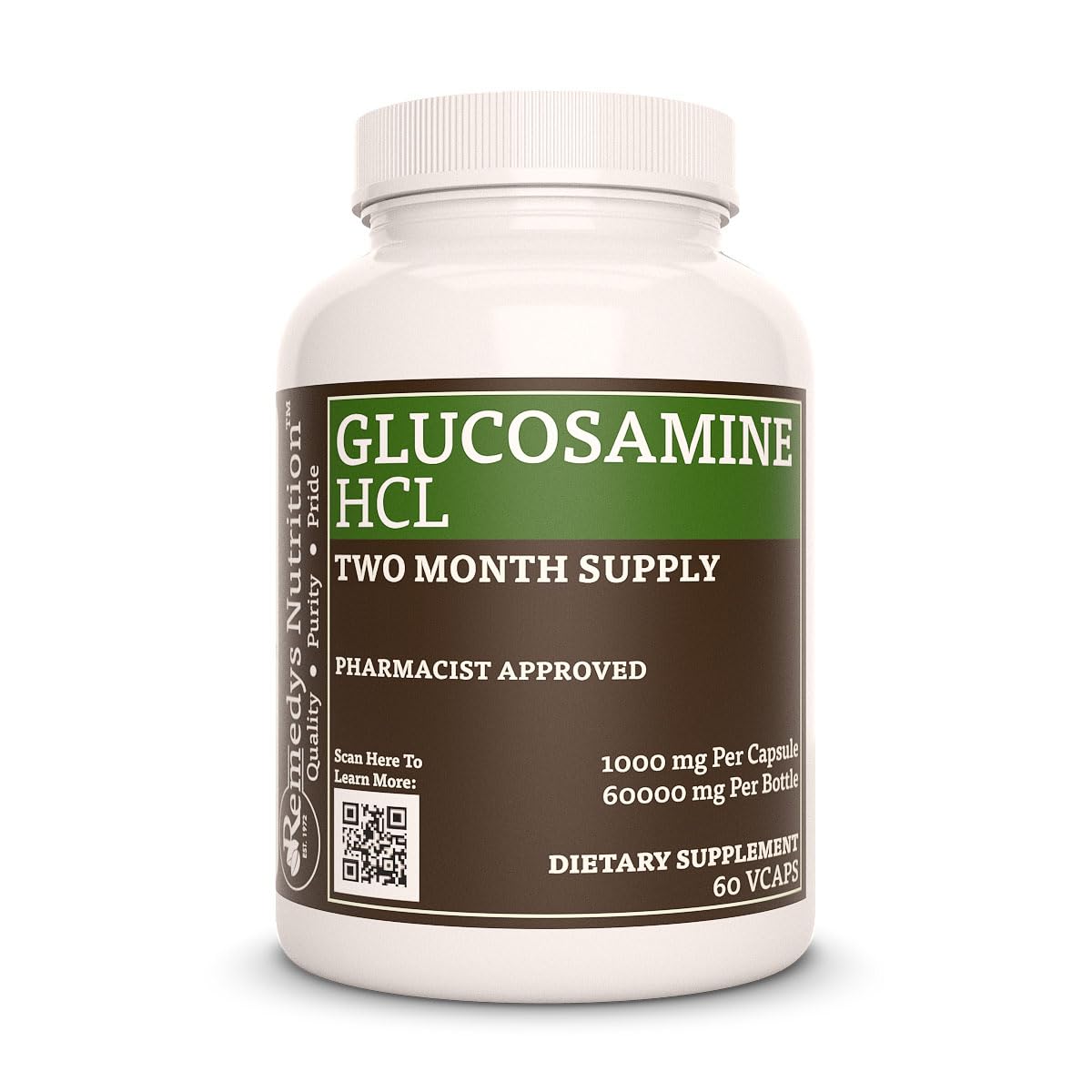 ABOUT US: We are a Family of Nutritionists, Herbalists, and other Healthcare Professionals Working Together to Bring You the Best of Traditional Medicinal and Today's Proven Science. Our Proprietary Supplements are Developed based on at least 7 Documented Clinical Studies by Respected Researchers and by Traditional Herbal Wisdom. You can trust Remedy's Nutrition!. OUR PRODUCTS: Hand Made for Every Order Since 1972. Manufactured On-Site in our Family Owned Business Location. 100 NATURAL INGREDIENTS: Never any Gluten, Wheat, Yeast, Lactose, Artificial Flavors, Sweeteners, Additives, or Preservatives Added. Non-GMO. Suitable for Vegetarians and Vegans. Just Wholesome Herbs!. WHAT YOU GET: One Bottle of Sixty Vegan Capsules with 1000mg each of Remedy's Nutrition Glucosamine HCL dietary supplement. (Two Month Supply). ABOUT THE SUPPLEMENT: Glucosamine is a natural compound that helps to build and repair cartilage in our joints. Those who lead active lifestyles may benefit from regular supplementation with Remedy's Nutrition Glucosamine HCL Capsules.