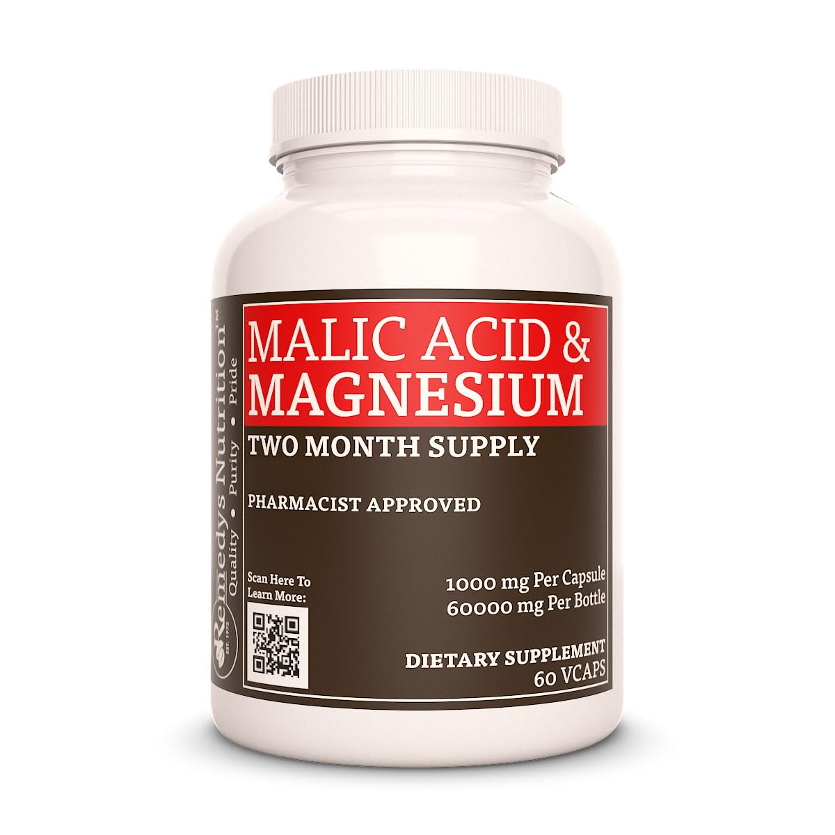 A LEGACY OF 50 YEARS: We are more than a family we are a collective of passionate nutritionists, herbalists, and healthcare professionals united in our mission to blend traditional wisdom with the advancements of modern science. Since 1972, each of our products has been meticulously handcrafted to order, lovingly created in our family-owned business location, ensuring that you receive nothing but the finest quality with every purchase. YOUR WELLNESS MATTERS: Your well-being is our topmost priority. We integrate extensive clinical research with traditional herbal wisdom to create products that prioritize your safety and health. With a remarkable 50-year legacy of research, testing, and continuous improvement, Remedy's Nutrition products inspire trust and confidence. ABOUT THE FORMULA: The main ingredients inside Malic Acid w Magnesium supplement are Malic Acid, which is a naturally occurring compound found in various fruits and vegetables and Magnesium Citrate, an essential mineral involved in numerous biochemical processes in the body. The blend also contains Nettle Leaf Alfalfa Leaf. WHAT YOU GET: One bottle of Remedy's Nutrition Malic Acid Magnesium supplement with sixty 1000mg vegan capsules. (Two Month Supply). ABOUT THE SUPPLEMENT: Remedy's Nutrition Malic Acid Magnesium Dietary Supplement consists of a proprietary blend that also includes Nettle Leaf Alfalfa.