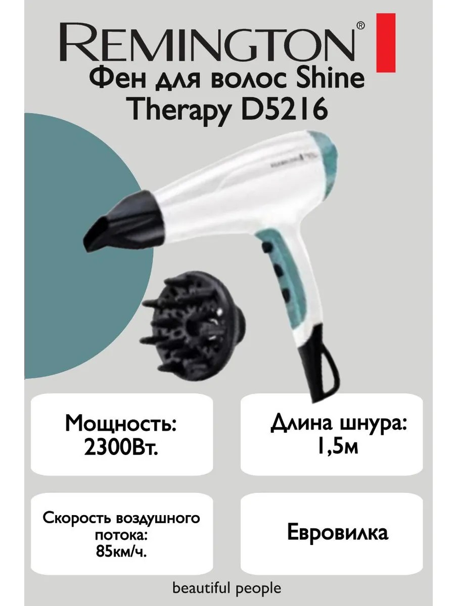 Представляем вам фен для волос Shine Therapy D5216 от Remington – ваш верный помощник в создании идеальной прически. Этот стильный белый фен не только эффективно сушит волосы, но и заботится о них, оставляя их блестящими и шелковистыми. Представьте, как легко и быстро вы сможете уложить волосы, получая при этом профессиональный результат. Shine Therapy D5216 – это идеальное сочетание мощности и бережного ухода. С ним ваши волосы всегда будут выглядеть здоровыми и сияющими.