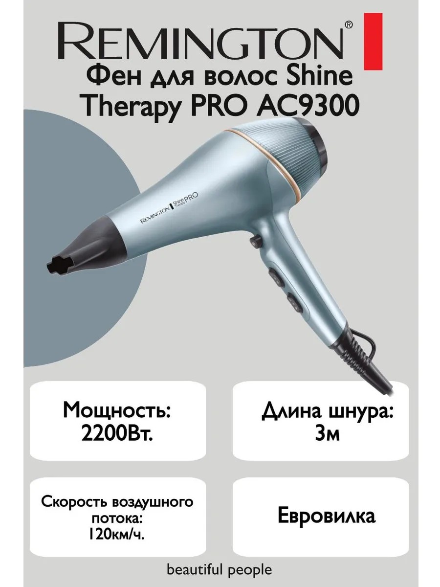 Introducing the Shine Therapy PRO AC9300 hair dryer from Remington – your reliable assistant for creating the perfect style. This stylish gray hair dryer not only effectively dries your hair but also cares for it, thanks to Shine Therapy technology. Imagine your hair becoming smooth, shiny, and silky after every blow-dry. With the Shine Therapy PRO AC9300, you can easily create any look, from natural curls to sleek locks. The powerful airflow quickly dries even thick hair, and the ergonomic handle ensures comfortable use. The Shine Therapy PRO AC9300 is the perfect combination of style, functionality, and care for your hair.