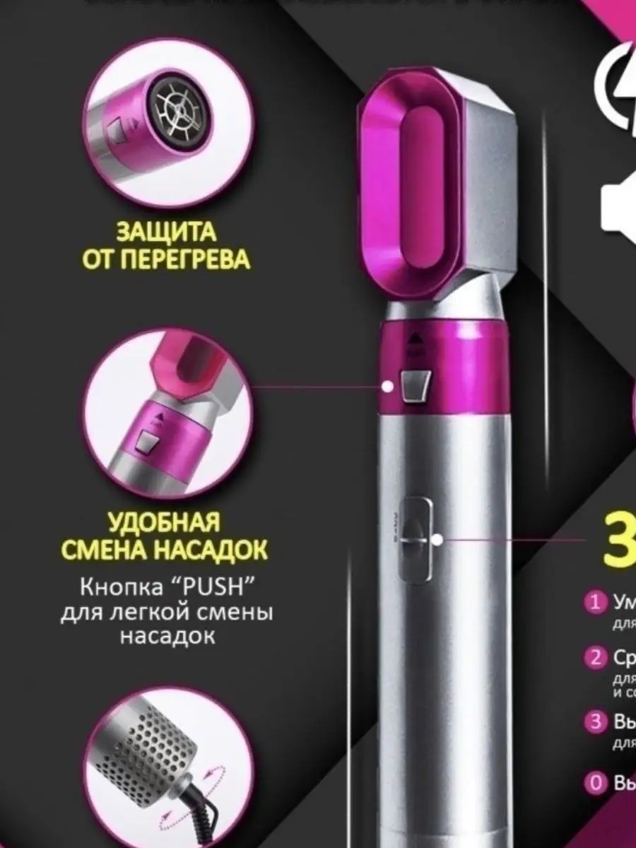 Лучший аналог Дайсон - стайлер для волос сделает безупречную укладку волос с помощью пяти насадок. Устройство одновременно высушивает и укладывает волосы, помогая сделать идеальную прическу. Мультистайлер для волос работает в трех режимах работы:- деликатная укладки и сушка;- формирование локонов;- быстрая сушка при высокой температуре.Использование различных насадок позволяет расчесывать, укладывать, сушить и выпрямлять волосы. Все насадки меняются при помощи легкого нажатия кнопки.Фен для волос обладает опцией ионизации, что обеспечивает их защиту и укрепление. Модель Dyson (аналог) имеет компактные размеры и работает практически в бесшумной режиме. Плойка для завивки волос позволяет создать стойкие локоны или бережно выпрямить их без повреждения структуры. Фен щетка для волос полноценно заменит фен, щипцы и утюжок. Устройство может выполнять функцию массажной расчески. Экономьте время и создавайте стильные образы с помощью удобного и безопасного стайлера.