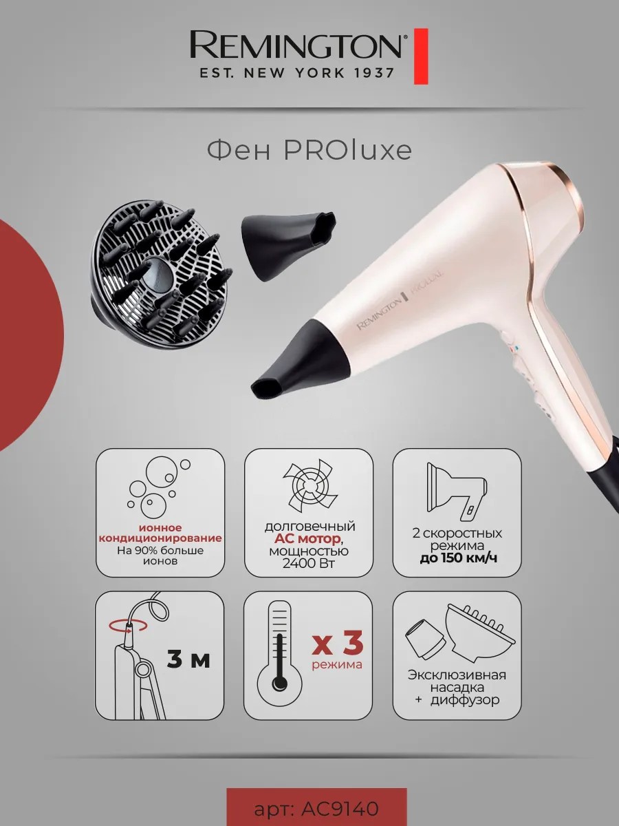 Этот профессиональный прибор станет отличным выбором как для домашнего ухода за волосами, так и для профессионального парикмахерского использования. Фен PROLuxe AC9140 создан специально для тех, кто ценит качество укладки, заботится о здоровье своих волос и хочет добиться профессионального результата самостоятельно.