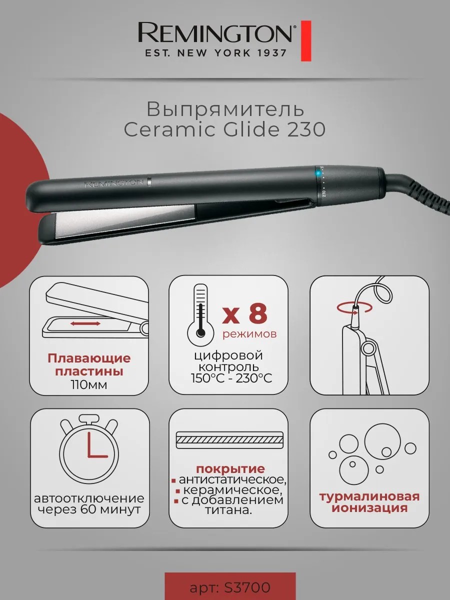 Выпрямитель для волос с керамическим покрытием Remington Ceramic Glide 230 S3700 представляет собой идеальное решение для тех, кто ценит качество, и безопасность при уходе за волосами.