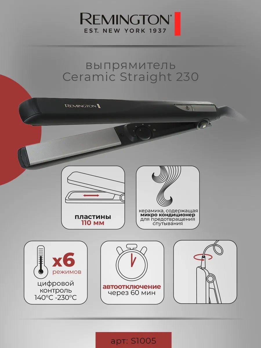 Выпрямитель для волос Remington Ceramic Straight 230 S1005 – это инновационное устройство, созданное для тех, кто ценит качество и эффективность в процессе ухода за своими волосами. Этот стильный и функциональный утюжок для волос обладает всеми необходимыми характеристиками, чтобы стать незаменимым помощником в создании идеальной укладки волос каждый день.