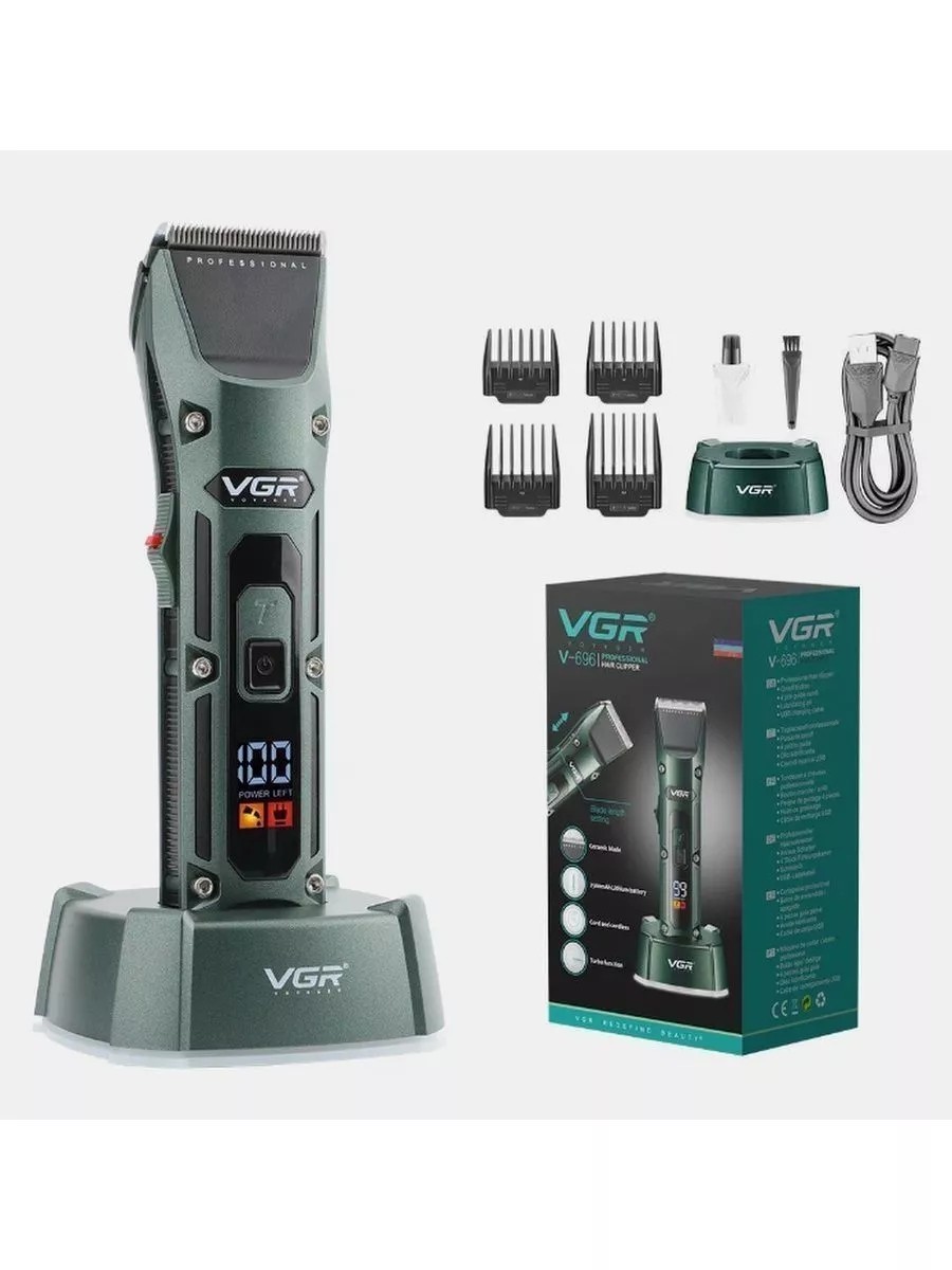 Профессиональная машинка для стрижки волос VGR. Мощный роторный двигатель с увеличенным крутящим моментом, имеет профессиональные ножи из нержавеющей стали. Отличаются своей твердостью и долговечностью, что позволяет машинке справляться с самыми густыми и жесткими волосами. Профессиональная машинка оснащена инновационным встроенным Li-Ion аккумулятором 2500 mAh. Вы можете выполнять стрижки как автономно, так и от сети. Отлично подходит для парикмахерской или домашнего использования. Led дисплей показывает уровень заряда аккумулятора. 2 скорости мотора. Характеристики: Бренд: VGR; Регулировка скорости моторчика: 2 варианта; LED дисплей: показывает уровень зарядки; Индикаторы: масла и заряда аккумулятора; Насадки: (4шт) ; Аккумулятор: Li-on 2500 mAh; Время зарядки: 3.5 часа; Время работы при полной зарядки 300 минут; Мощность: 8 Вт; Мотор: роторный 6500об/мин; Зарядка: USB провод без блока; Шнур USB без блока питания: 1.4 м; Низкий уровень шума - подходит для стрижки детей; Применение: Стрижка волос, бороды; Материал лезвия: Нержавеющая сталь; Регулировка лезвия: 0.8 - 2.0 мм; Регулируемое лезвие; Ширина ножа: 45мм; Материал корпуса: Металл; Комплектация: Машинка для стрижки; насадки - 4 шт; Шнур USB без блока питания; щетка для чистки; масло смазочное; инструкция по эксплуатации, подарочная коробка. Машинка для стрижки волос прекрасный подарок на день рождения, 23 февраля и другие праздники. Выбирая бытовую технику, вы выбираете легкость в работе, отсутствие необходимости посещать салон для мужчин. Профессиональная машинка для стрижки волос VGR V-696 лучший аналог машинок для стрижки известного бренда Philips.
