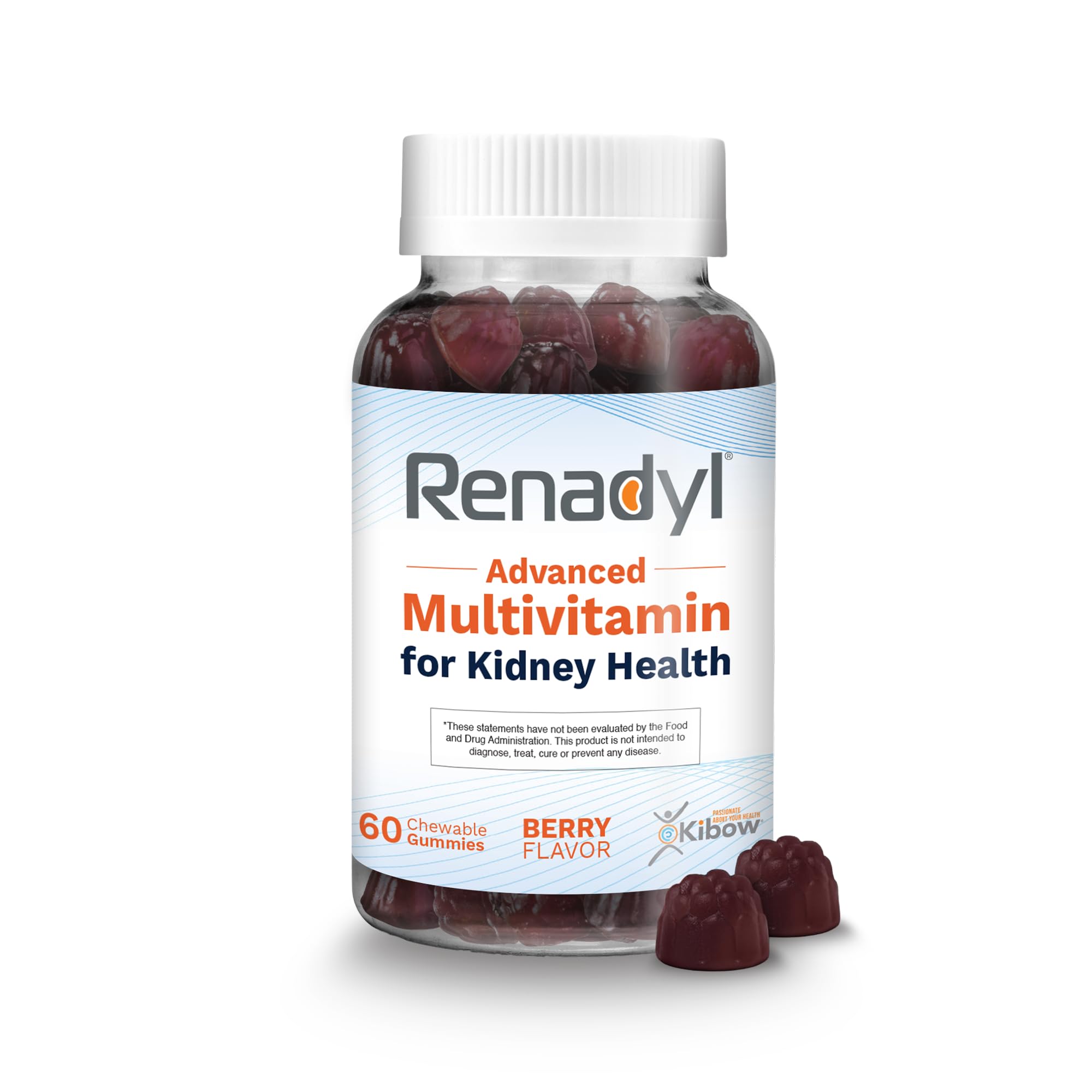 Experience Renadyl Gummy Multivitamin, a convenient and delicious way to support your kidney health. The perfect companion, it is designed to complement, not replace, Renadyl probiotic, offering an enjoyable way to support your overall kidney health and quality of life. This next-generation multivitamin includes only optimized levels of B Vitamins, Vitamin C and essential minerals, filling essential nutrient gaps without the additives that don't belong in a renal-friendly routine. It's the only soft-chew gummy with active form of Vitamin B9 (Folate), L-methyl-folate, CoQ10, and no phosphorus or potassium. These gummies are sugar-free, dairy-free, allergen-free, vegan, non-GMO, and made with no artificial colors or flavors. Proudly made in the USA by Kibow Biotech, a leader in nutritional research, these berry-flavored gummies provide a simple, great-tasting solution to maintain daily wellness. Consume two gummies daily as part of your kidney health routine.These statements have not been evaluated by the Food and Drug Administration. This product is not intended to diagnose, treat, cure, or prevent any disease. INGREDIENTS: Thiamin, Riboflavin, Niacin, Vitamin B6, Folate, Vitamin B12, Biotin, Pantothenic Acid, Vitamin C, CoQ10, Iron, Zinc, Selenium, Copper, ISO Malt powder, Maltitol, Pectin blend, Citric acid, Trisodium citrate, Natural Color Flavor. MADE IN THE USA BY KIBOW BIOTECH, HEADQUARTERED IN EXTON, PA. Renadyl Advanced Multivitamin for Kidney Health is made in the USA by Kibow Biotech, the leader in kidney research for over two decades. Kibow Biotech is committed to offering the highest quality and affordable non-drug dietary vitamins and supplements, making good kidney health accessible to everyone. SUGGESTED USE: Consume two (2) delicious, berry-flavored gummies daily. SUGAR-FREE, ALLERGEN-FREE, DAIRY-FREE, VEGAN, NON-GMO, AND NO ARTIFICIAL COLORS OR FLAVORS. Contains no sugar, milk, eggs, fish, shellfish, tree nuts, peanuts, wheat, soybeans, or animal-derived ingredients. A clean-label formula—thoughtfully crafted to support people managing diabetes, food sensitivities, or other dietary restrictions. THE PERFECT COMPANION TO RENADYL PROBIOTIC. Renadyl Advanced Multivitamin is not a replacement for Renadyl probiotic. It is designed to work alongside Renadyl, the 1 nephrologist-recommended, patented probiotic health supplement clinically proven to improve or maintain kidney function and help support quality of life. Used together, they deliver more complete kidney health support. THE FIRST ONLY GUMMY MULTIVITAMIM SPECIALLY FORMULATED TO SUPPORT KIDNEY HEALTH. Optimized levels of essential vitamins and minerals. Includes Coenzyme Q10 (CoQ10). No phosphorus or potassium. TAKE EVEN GREATER CONTROL OF YOUR KIDNEY HEALTH. Renadyl Advanced Multivitamin for Kidney Health is a next-generation, great-tasting, chewable gummy multivitamin.
