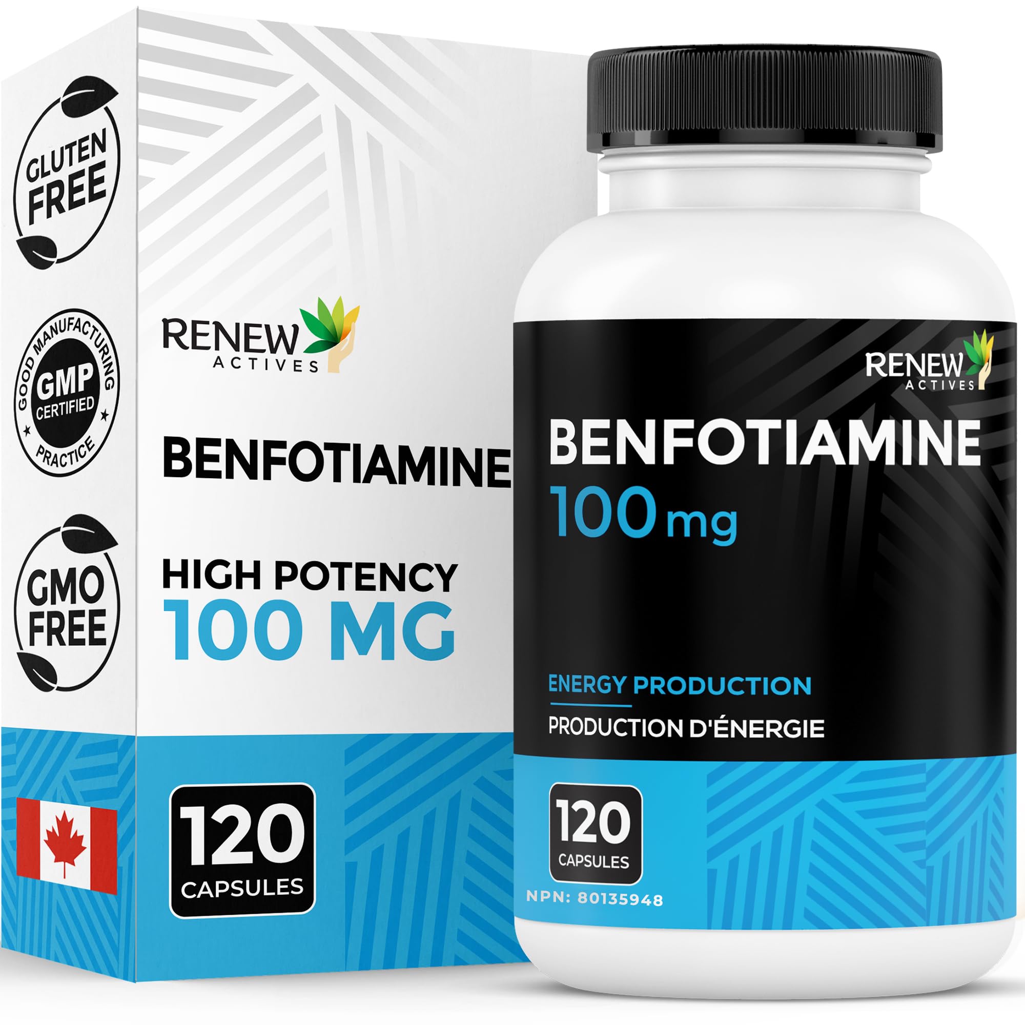 Renew Actives Benfotiamine 100mg Supports Energy Production & Overall Wellness Vegan Non-GMO Gluten-Free 120 Capsules