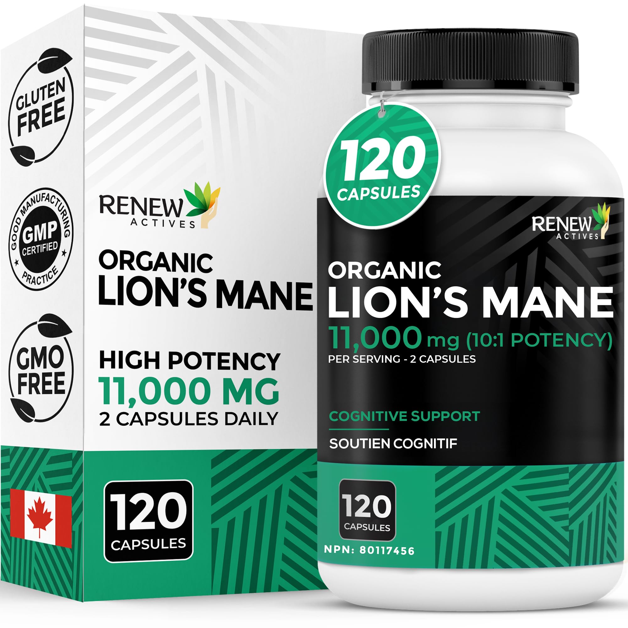 Renew Actives Premium Organic Lion's Mane Mushroom 1100MG per 2 Capsules - Supports Brain Function Memory Focus Stress Relief & Immune Health Non-GMO Vegan - Made in Canada - 120 Capsules