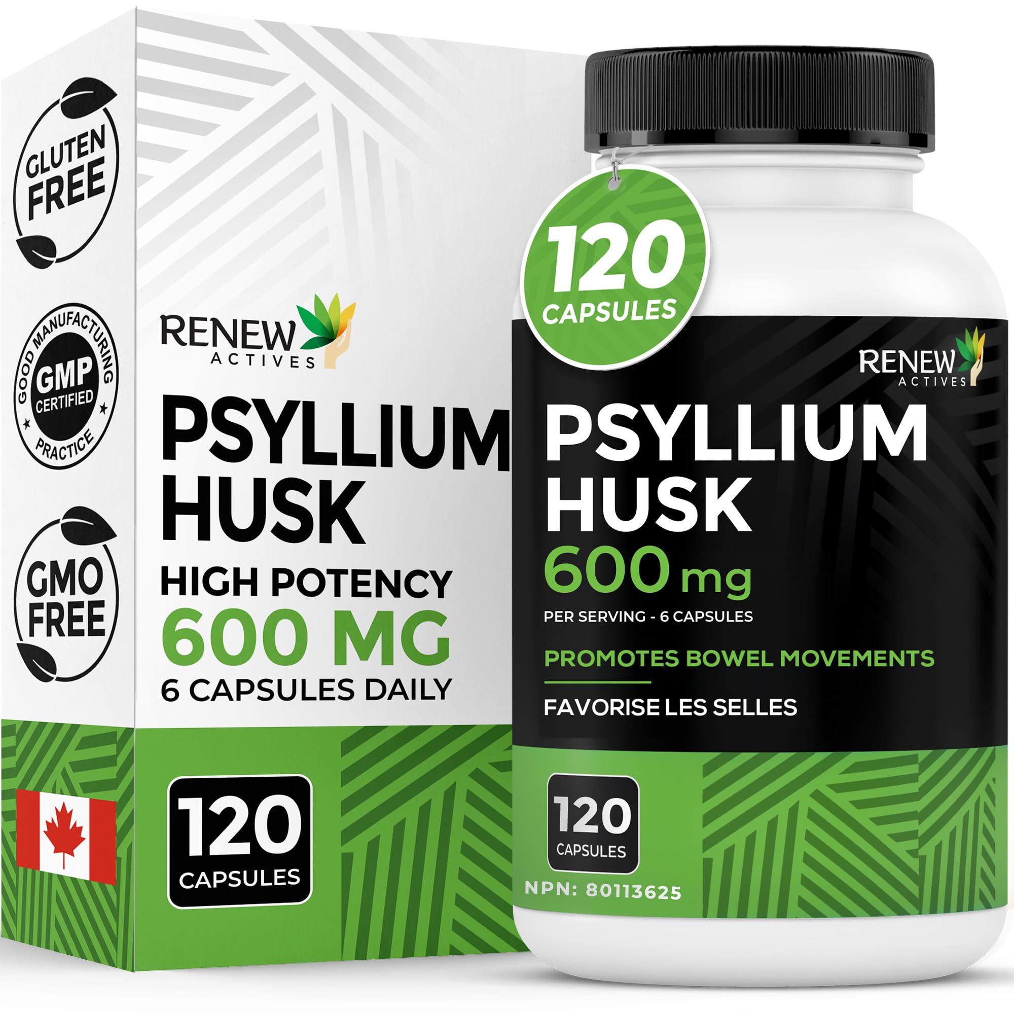 Renew Actives Psyllium Husk 1200MG per 2 Capsules Bulk-Forming Laxative & Soluble Fiber for Digestive Health Regularity & Adult Wellness Pure Ingredients Made in Canada 120 Capsules