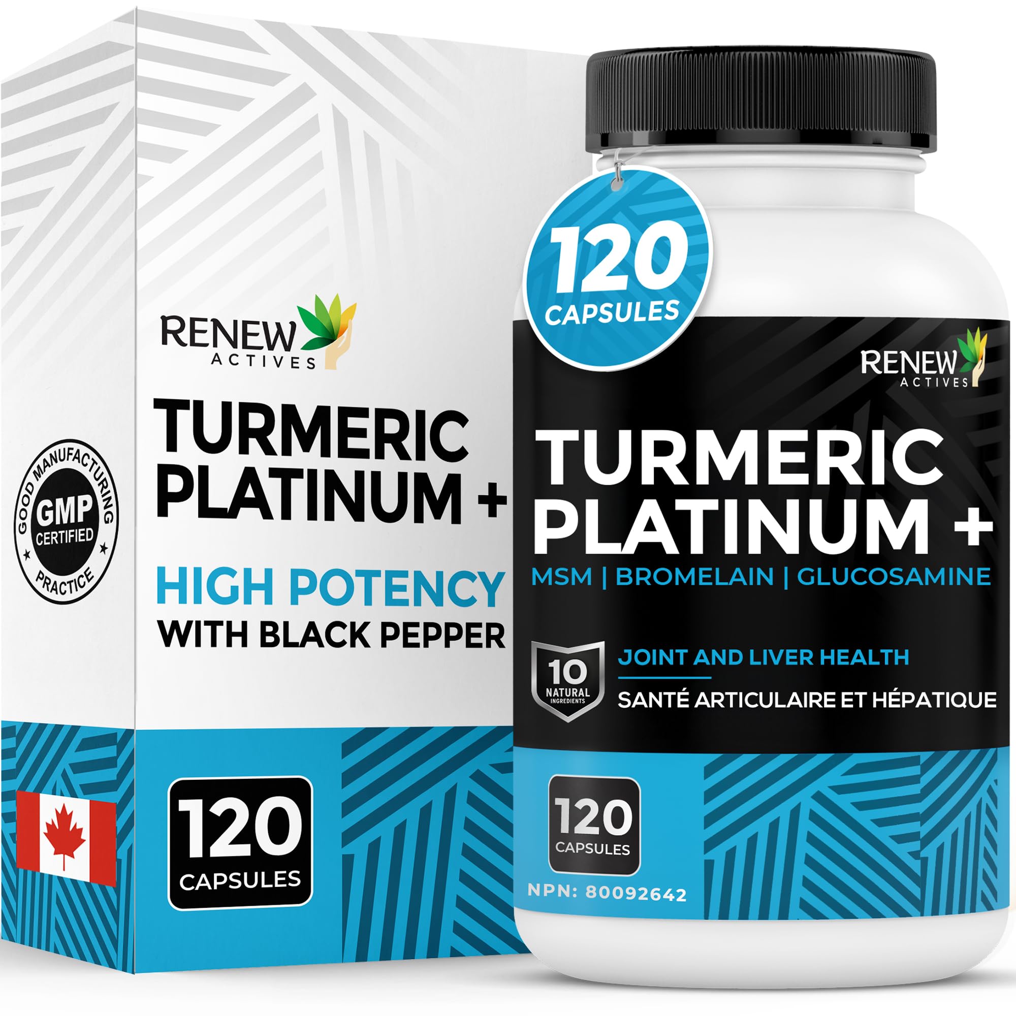 EASY TO TAKE: The easy-to-swallow capsules are designed for convenience, fitting seamlessly into your daily routine. They provide a hassle-free way to enhance your overall health, helping you maintain well-being without disruption. NPN: 80092642. COMPREHENSIVE WELLNESS: Renew Actives Turmeric Platinum enhances multiple aspects of health with a holistic approach. Its targeted ingredients help strengthen immune function, manage inflammation, and improve overall vitality and well-being. DIGESTIVE HEALTH: This supplement is formulated with carefully selected ingredients like Turmeric, Ginger, and Black Pepper to promote optimal digestive health, aiding smoother digestion, better nutrient absorption, and overall gut wellness. ANTIOXIDANT RICH: Renew Actives Turmeric Platinum delivers a potent blend of antioxidants, including Curcumoids, Ginger, and Black Pepper, to help defend against oxidative stress and enhance your body's natural defense against free radical damage. POWERFUL FORMULA: Unlock the full potential of Renew Actives Turmeric Platinum with 11 potent ingredients like Curcumoids, Ginger, and Black Pepper. This formula is crafted to maximize wellness benefits and enhance overall health. Made in USA and Imported. Approved and Licensed by Health Canada: NPN 80092642.