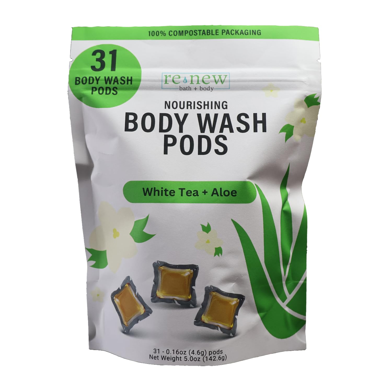 Renew Bath + Body Moisturizing Body Wash Pods White Tea & Aloe Scent Eco-Friendly and Cruelty Free Plant-Based Packaging - Plastic Free - Ocean Safe 31 Pods