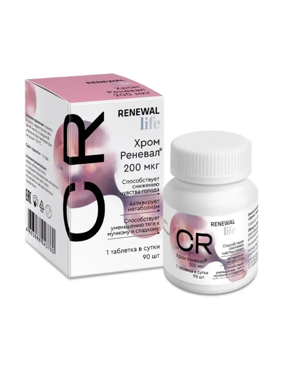 ХРОМ ТОВАРНОГО ЗНАКА РЕНЕВАЛ - Биологически активная добавка (БАД) к пище - способствует снижению чувства голода. Хром - жизненно важный микроэлемент. Он участвует в процессе регулирования обмена жиров, углеводов и стабилизации уровня сахара в крови, что особенно важно для людей с повышенным уровнем сахара. Участвует в регуляции работы сердечной мышцы и функционировании кровеносных сосудов. Для улучшения усвояемости хрома используют его соединение с органическими кислотами, чаще всего пиколинат хрома. Ежедневный прием пиколината хрома помогает избавиться от навязчивого чувства голода, а также улучшает работоспособность и повышает жизненную энергию. Способствует выведению из организма токсинов, солей тяжелых металлов, радионуклидов. Дополнительное потребление пиколината хрома позволяет нарастить мышечную массу, что способствует сокращению содержания жира в организме.