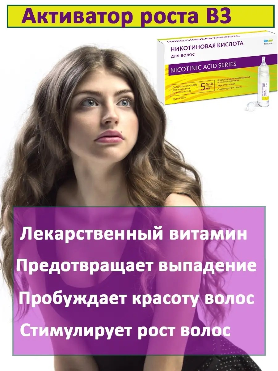 For hair growth, nourishment to the roots is essential, which is only possible with improved blood circulation to the hair follicles. Only vitamin B3 (niacin for hair) has the ability to dilate root capillaries without irritating or overdrying the scalp, and delivers all the vitamins needed for hair! Any hair product will be ineffective without normalized blood circulation. Nicotinic acid—that's what will help! Beautiful hair, shine, volume and thickness, restoration of color and structure after dyeing, childbirth, or seasonal hair loss—these are the effects of our product! No miracles! Only the healing properties of concentrated vitamin B-B3! Your hair care will reach a new level! All other hair growth products: hair tonic, hair mask, hair serum - will become twice as effective due to better absorption! Use a course of 14 treatments, repeating every three months! You will be satisfied!