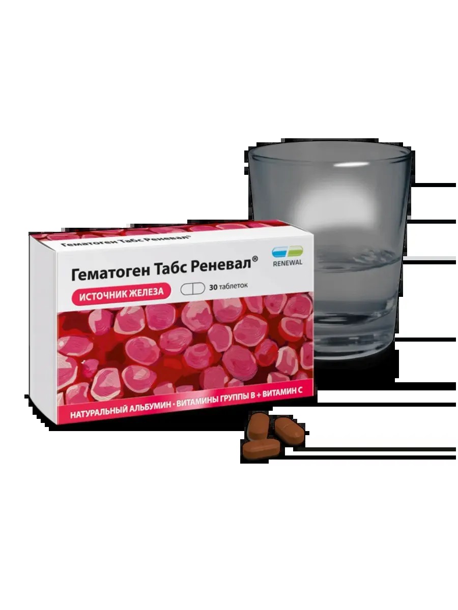 Hematogen Tabs Renewal is a unique combination of divalent iron, albumin, and vitamins. It is an additional source of iron. It is involved in hematopoiesis and, as part of hemoglobin, ensures oxygen transport to tissues.