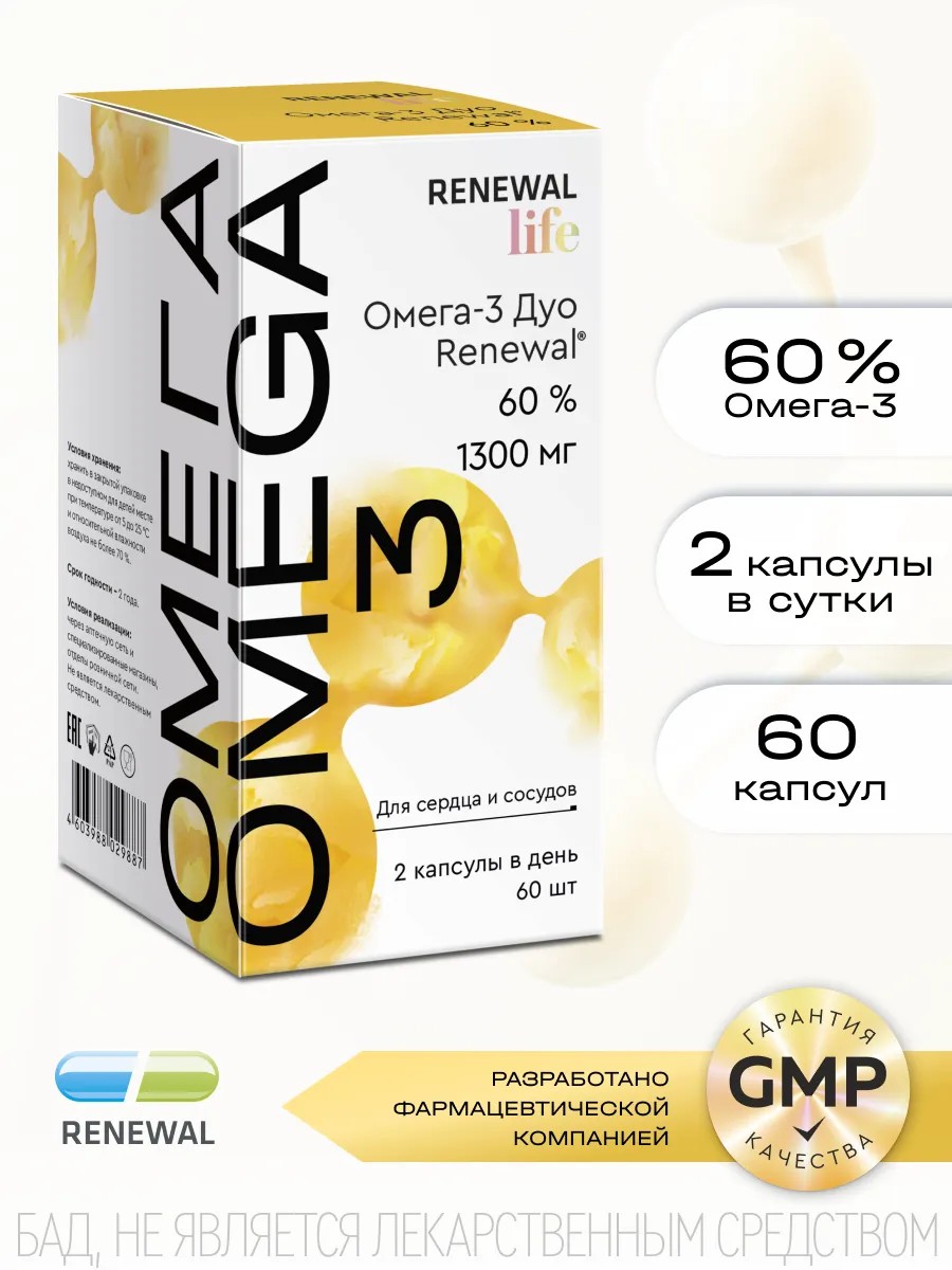 Polyunsaturated fatty acids are not synthesized in the body and are essential in the daily diet. Omega-3 plays a vital role in maintaining normal cardiovascular function, improves brain function, and strengthens the immune system. Regular use of these capsules helps lower cholesterol and maintain joint health, which is especially important given an active lifestyle. Derived from fatty northern fish, our capsules are distinguished by their high quality and purity. Highly concentrated omega-3 (600 mg per capsule) in the form of ethyl esters is aimed at supporting cardiovascular health. Omega-3 PUFAs have a significant effect on the hemostasis system: they help reduce blood viscosity, inhibit thrombosis, prevent cholesterol deposits in blood vessels, and reduce the risk of arrhythmia. Renewal products comply with GMP and ISO 9001:2015 quality standards. Renewal, a pharmaceutical manufacturing company, develops and produces modern, high-quality, and affordable pharmaceuticals.