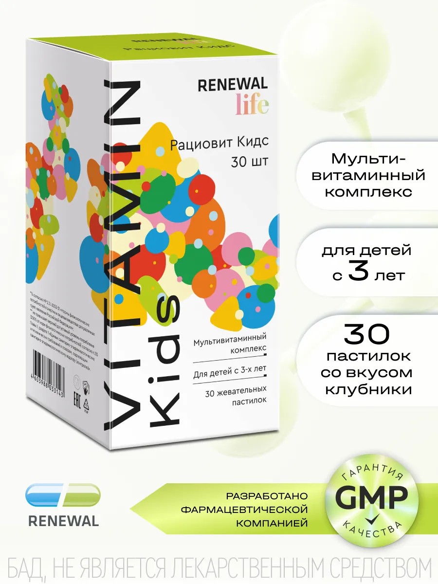 | Торговое наименование | биологически активная добавка к пище "Рациовит Кидс мультивитаминный комплекс" (жевательные пастилки массой 3 г в потребительской упаковке - для реализации населению, в упаковке "in bulk" от 0,5 кг до 10 кг - для последующей расфасовки) |