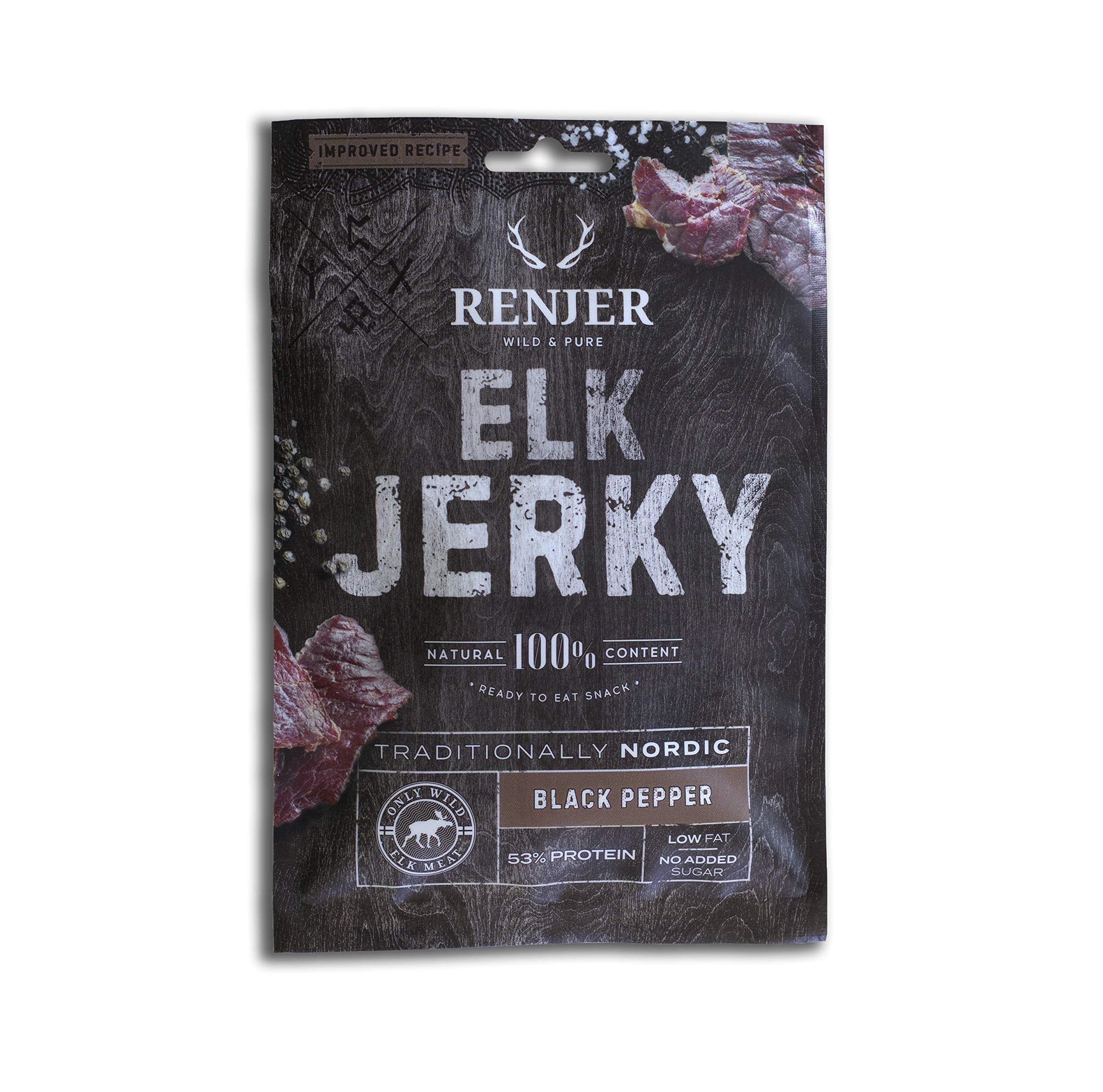 Wild Pure Nordic Every black pepper jerky has a long tradition in RENJER's history. To honor this tradition, but also to take a step into the future, we've created a new, modern flavor: BLACK PEPPER JERKY EVERY. This new variation of our original moose jerky is just the right choice for anyone who's always wanted our jerky with a good pinch of black pepper. The moose meat used in our products comes from Scandinavian and Baltic forests and is 100 wild-caught. And believe us, with this modern version of our fox elk jerky, we don't just want to offer an alternative to the classic. We're even convinced that the peppered version could become your new favorite (at least if you like pepper). INGREDIENTS Each meat (Alces Alces) (90 ), sea salt, white wine vinegar, stabilizer: citrus, spice mix, black pepper (1.17 ).