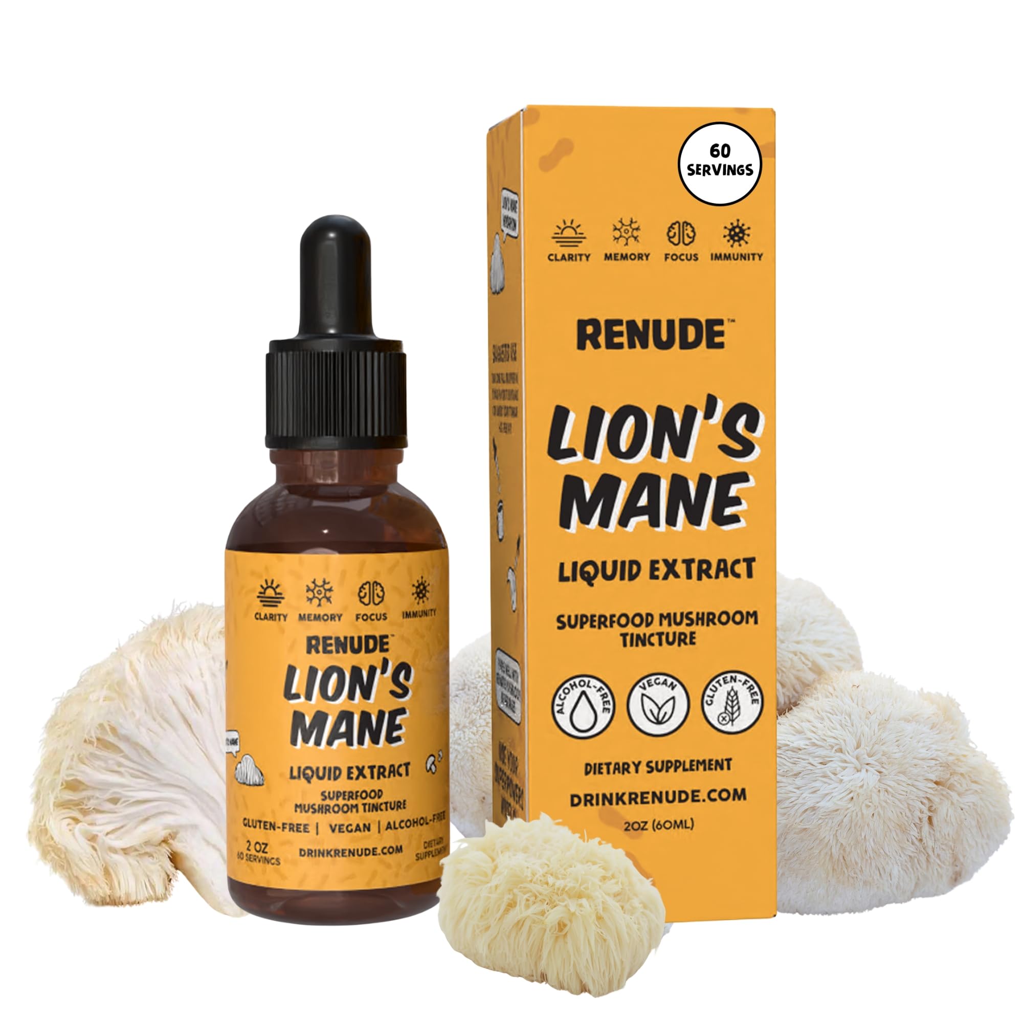 Renude Lion's Mane Liquid Extract - Mushroom Tincture Lions Mane Drops Supplement for Brain & Immune Support Promotes Focus & Memory Superfood Elixir for Men & Women Alcohol Free Vegan - 2 oz