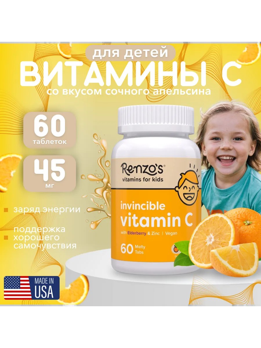 Renzo's Invincible Vitamin C — в виде тающих таблеток без сахара. Встречайте супергероев иммунитета! Этот невероятный детский витамин С богат антиоксидантной силой витамина С, цинка и бузины. Когда они объединяют свои силы, то помогают защитить и укрепить иммунитет вашего ребенка. Изготовлен без сахара, желатина или ГМО.