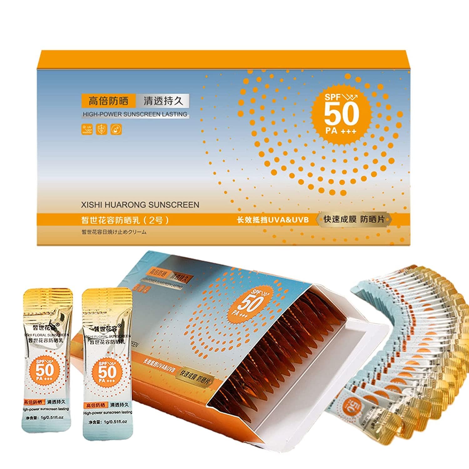 DESCRIPTION DU PRODUIT DESCRIPTION DU PRODUIT Specification: Sun protection index: PA50 Capacity: 1g strip Quantity: 50 strips box Skin Type: Normal,General,Oily,Dry,Sensitive,Combination Application area: face body can be used Package: 2 box Super Sunscreen AVERTISSEMENT DE SÉCURITÉ 1How to use At the last step of basic skincare, evenly apply an appropriate amount on the face. Reapply as needed by carrying it with you. Protable Independent pouch packaging, customized for your travel, compact and portable, easy to use, provides reliable protection anywhere you go. You can use it as the last step of your morning routine or reapply in the middle of the day without worrying about messing up your makeup. Weightless and Refreshing This lightweight sunscreen is packed with hydrating ingredients, oil free formula, is weightless and refreshing, greasy feeling, keeping skin hydrated and supple. our sunscreen is very gentle and safe to use as a daily moisturizing sunscreen to moisturize and protect your skin. Super Sun Protection This facial hydrating sunscreen is strong UV protection, effectively protecting your skin from harmful, prevent sunburn and sun-related aging. Moisturizing Sunscreen This SPF50 sunscreen rich in hydrate essence, lightweight texture, it's a super refreshing, moisturizing and invisible sunscreen that feels natural to the skin and is perfect for summer. High-Power Sunscreen Lasting.2 Box Super Sun Protection Sunscreen,Xishi Huarong Sunscreen Spf50 Moisturizing Sunscreen Lasting Protection SunscreenDESCRIPTION DU PRODUIT DESCRIPTION DU PRODUIT Specification: Sun protection index: PA50 Capacity: 1g strip Quantity: 50 strips box Skin Type: Normal,General,Oily,Dry,Sensitive,Combination Application area: face body can be used Package: 2 box Super Sunscreen AVERTISSEMENT DE SÉCURITÉ 1How to use At the last step of basic skincare, evenly apply an appropriate amount on the face. Reapply as needed by carrying it with you. Protable Independent pouch packaging, customized for your travel, compact and portable, easy to use, provides reliable protection anywhere you go. You can use it as the last step of your morning routine or reapply in the middle of the day without worrying about messing up your makeup. Weightless and Refreshing This lightweight sunscreen is packed with hydrating ingredients, oil free formula, is weightless and refreshing, greasy feeling, keeping skin hydrated and supple. our sunscreen is very gentle and safe to use as a daily moisturizing sunscreen to moisturize and protect your skin. Super Sun Protection This facial hydrating sunscreen is strong UV protection, effectively protecting your skin from harmful, prevent sunburn and sun-related aging. Moisturizing Sunscreen This SPF50 sunscreen rich in hydrate essence, lightweight texture, it's a super refreshing, moisturizing and invisible sunscreen that feels natural to the skin and is perfect for summer. High-Power Sunscreen Lasting.