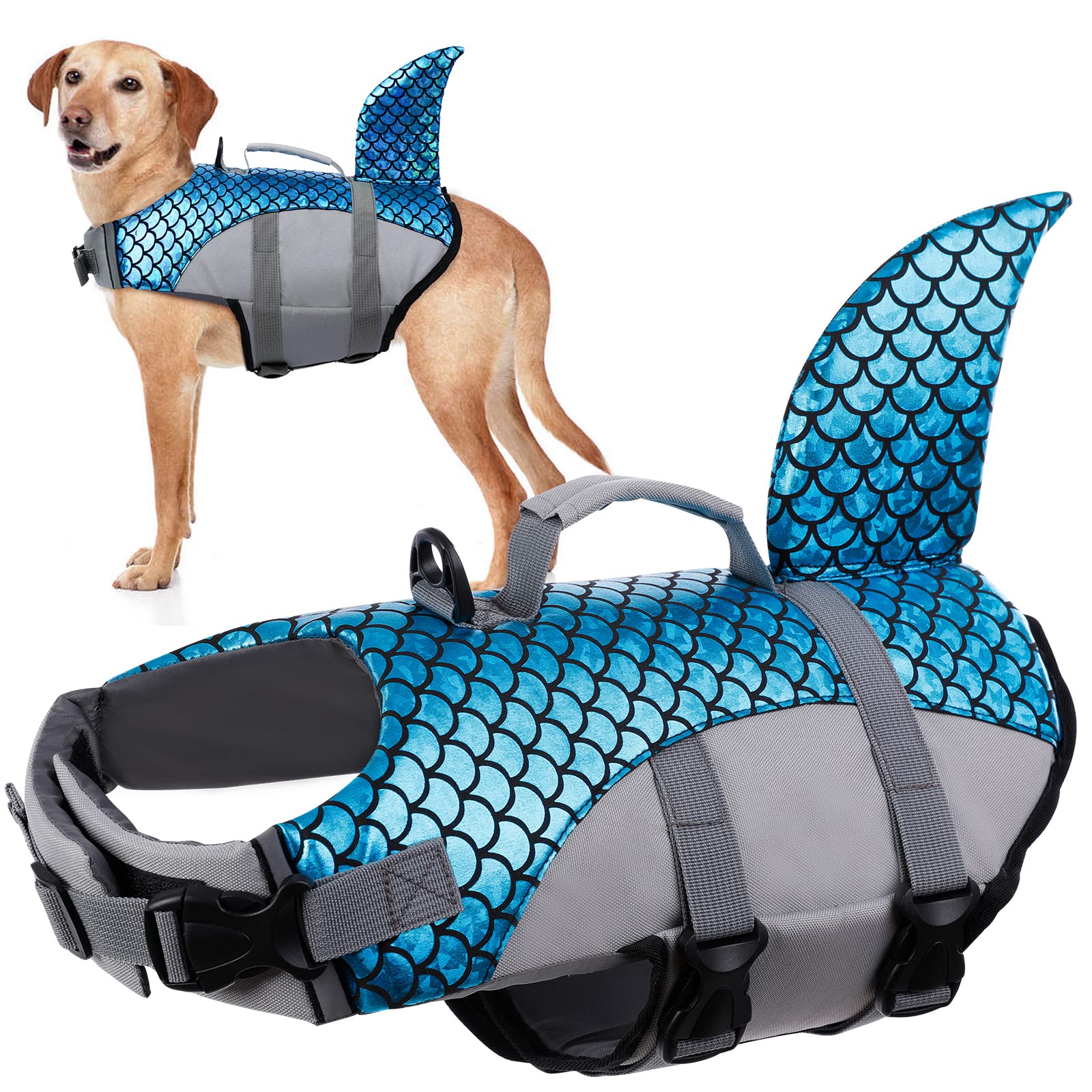 Sizes: 6 sizes are available: XS, S, M, L, XL, XXL.3 colors to choose from: blue, gray and pink.Please measure the neck circumference, the breast and back length of your dog to choose the right size.Practical: The life jacket is perfect for use in different places: beach, pool, boating, sea, sea, swimming, hunting, surfing etc. Suitable for dogs of different sizes such as teddy bear, chihuahua, dwarfpinscher, schnauzer, samo, husky,Golden Retriever, German Shepherd, Rottweiler, Alaska etc. Settable and safe: Practical Velcro fastener and quick locking buckles around the neck and body of the life jacket enable an adaptation to the size of your dog and a tight fit for maximum safety.The practical attachment enables your dogs to swim longer and is suitable for water activities.hai design and integrated handle: The fish scales on the back are made of laser fabric, which is very dazzling in the sun.The tail of the shark-shaped dog vest can be hung over the water, constructed with a durable handle handle and D-ring in the back area, comfortably and comfortably enough to reach your dogs when you put them in the water or help to get out of the water and d-Ring for attaching the leash.Premium material: The life jacket consists of waterproof 600dpu oxford fabric with dense yarn.It uses the internal floating 1.5 cm environmentally friendly EPE pearl sponge material, which ensures good buoyancy and keeps dogs safe in the water.Größen: Es sind 6 Größen verfügbar: XS, S, M, L, XL, XXL. 3 Farben zur Auswahl: blau, grau und pink. Bitte messen Sie den Halsumfang, die Brust- und Rückenlänge Ihres Hundes, um die richtige Größe zu wählen. Praktisch: Die Schwimmweste ist perfekt für den Einsatz an verschiedenen Orten: Strand, Pool, Bootfahren, See, Meer, Schwimmen, Jagen, Surfen usw. Geeignet für Hunde unterschiedlicher Größe wie Teddybär, Chihuahua, Zwergpinscher, Schnauzer, Samo, Husky, Golden Retriever, Deutscher Schäferhund, Rottweiler, Alaska usw. Einstellbar und Sicher: Praktischer Klettverschluss und Schnellverschlussschnallen um Hals und Körper der Schwimmweste ermöglichen eine Anpassung an die Größe Ihres Hundes und eine enge Passform für maximale Sicherheit. Die praktische Befestigung ermöglicht es Ihren Hunden, länger zu schwimmen und ist für Wasseraktivitäten geeignet. Hai-Design und Integrierter Griff: Die Fischschuppen auf der Rückseite sind aus Laserstoff, der in der Sonne sehr blendet. Der Schwanz der haifischförmigen Hundeschwimmweste kann über dem Wasser aufgehängt werden, konstruiert mit strapazierfähigem Haltegriff und D-Ring im Rückenbereich, bequem und bequem genug, um Ihre Hunde zu greifen, wenn Sie sie ins Wasser setzen oder helfen um aus dem Wasser zu kommen und D-Ring zum Befestigen der Leine. Premium-Material: Die Schwimmweste besteht aus wasserdichtem 600DPU-Oxford-Gewebe mit dichtem Garn. Es verwendet das interne schwimmende 1,5 cm umweltfreundliche EPE-Perlenschwammmaterial, das einen guten Auftrieb gewährleistet und Hunde im Wasser sicher hält.Rettungsweste für Hunde, Hundschwimmweste Verstellbare Sicherheitsjacke für Hundeflotation Hai Sicherheitsweste Lifesaver Schwimmtraining Sommerbadebekleidung für Hunde(Blau, XL) XL Blau