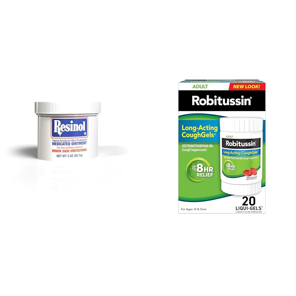 This convenient bundle pairs Resinol Medicated Ointment for itch relief and skin protection with Robitussin Adult Long-Acting CoughGels for cough suppression. The 3 ounce jar of Resinol ointment relieves pain and itching while protecting, soothing, and promoting healing of skin irritations like rashes, minor burns, cuts, scrapes, bug bites, and poison ivy. Its thick petroleum texture creates an effective skin barrier. The antiseptic and disinfectant properties of the active ingredient resorcinol make this ointment ideal for treating insect bites, minor wounds, and dry, chapped skin. The 20 liquid-filled capsules of Robitussin cough gels provide up to 8 hours of cough relief per dose. The long-acting dextromethorphan cough suppressant reduces cough urges and delivers dry cough relief during the day without drowsiness. The convenient capsules are easy to take at home or on the go. Together, these products address common irritating symptoms. The Resinol ointment soothes skin irritations, while the Robitussin capsules suppress coughs. Both provide long-lasting relief from discomfort, making this bundle useful to have on hand for various household needs.